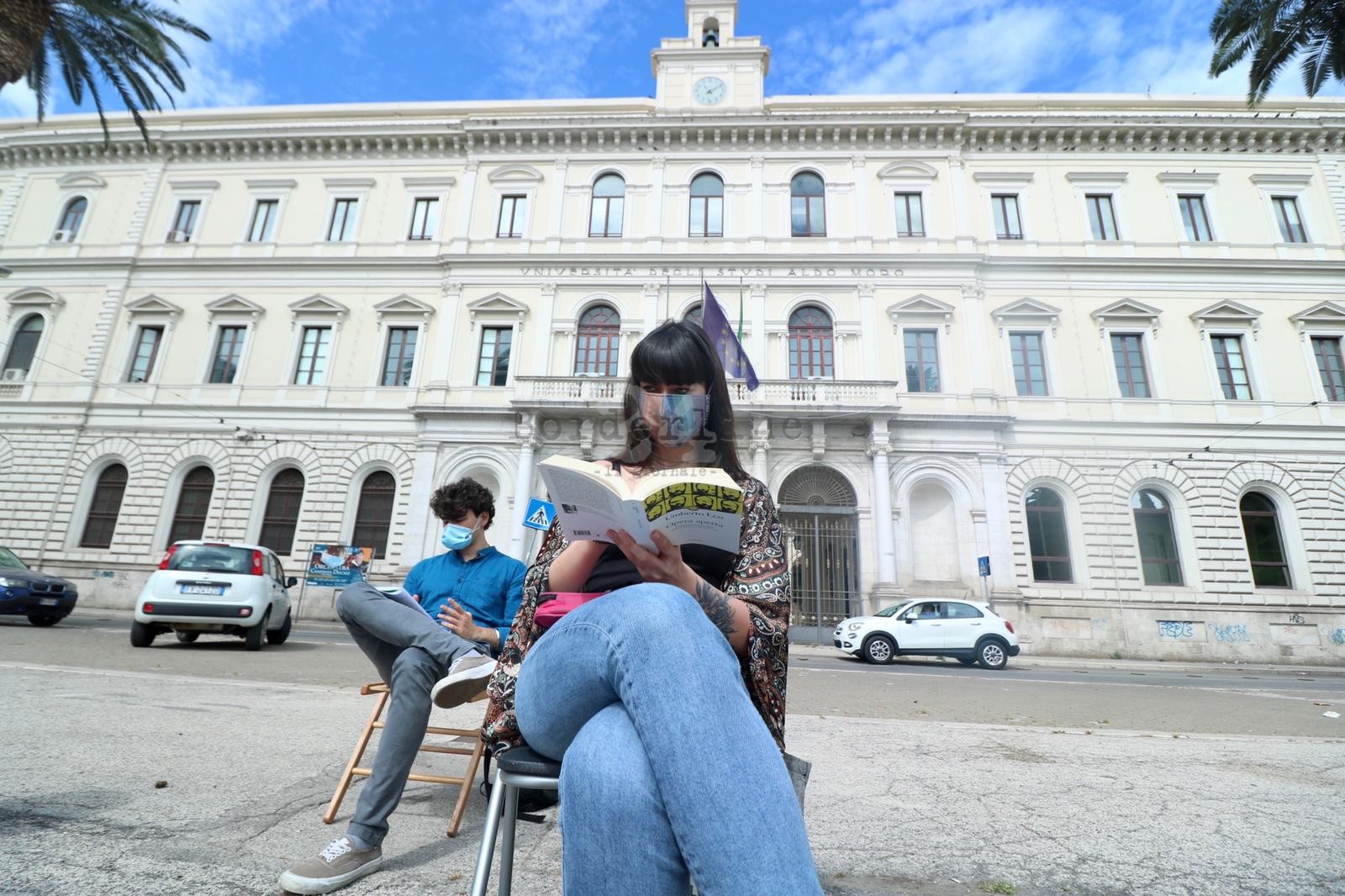 Per l’occasione i ragazzi, a distanza di almeno un metro e con la mascherina, hanno portato computer e libri all’aperto: “Non tutti hanno la fortuna di poter trovare luoghi idonei in cui potersi contentare – commenta nel video il portavoce Stefano Scoppio – molti vivono in case piccole con la famiglia o in situazioni di disagio. Le sono biblioteche chiuse ma non possiamo acquistare tutti i testi, soprattutto per chi dovrà laurearsi a breve”.