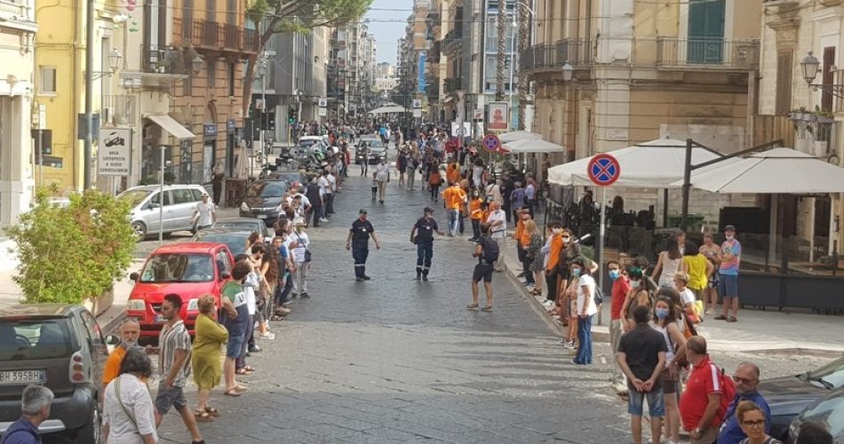 Si è svolto questo pomeriggio il flash mob “Abbraccio alla città”, nel corso del quale i volontari, gli operatori sociali e i medici che hanno sostenuto la rete cittadina del welfare durante l’emergenza sanitaria hanno formato una catena umana per rivolgere un abbraccio ideale a tutta la città. I partecipanti, distanziati nel rispetto delle misure di contenimento previste, si sono disposti sul percorso da piazza Chiurlia, sede dell’assessorato al Welfare, al primo isolato di via Sparano.