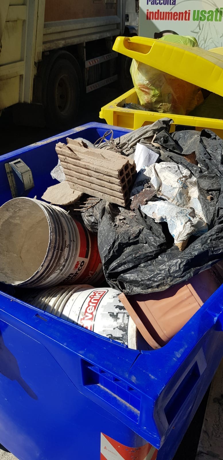 Barattoli di vernice, un bustone di plastica e persino un mattone forato. Il tutto abbandonato all’interno di un cassonetto riservato allo smaltimento della carta in via Resta, a Torre a Mare.