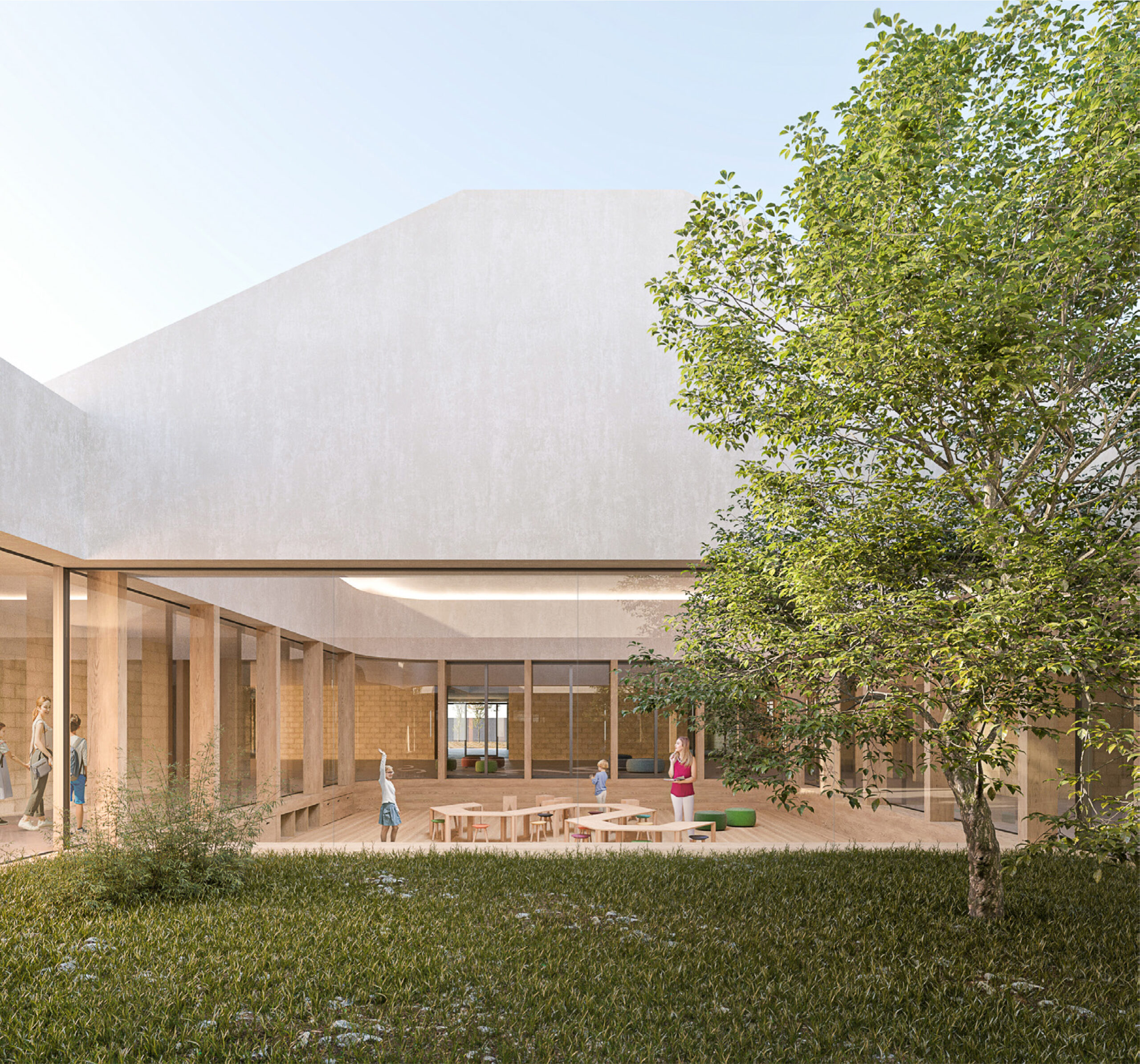 Il patio, ponendosi al centro dell’edificio, diventa il perno attorno a cui si svolgono tutte le attività quotidiane. I laboratori sono il luogo dove più viene sviluppata e stimolata la creatività del bambino: due ambienti estremamente flessibili che aiutano ad accentuare la sensazione di scoperta. La scelta di creare un ambiente centrale, ribassato nella quota e racchiuso da pareti vetrate, vuole stimolare i bambini nella percezione che hanno di se stessi nello spazio, nella relazione visiva con il patio verde o con gli spazi aggregativi adiacenti.