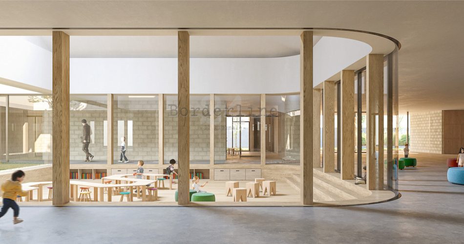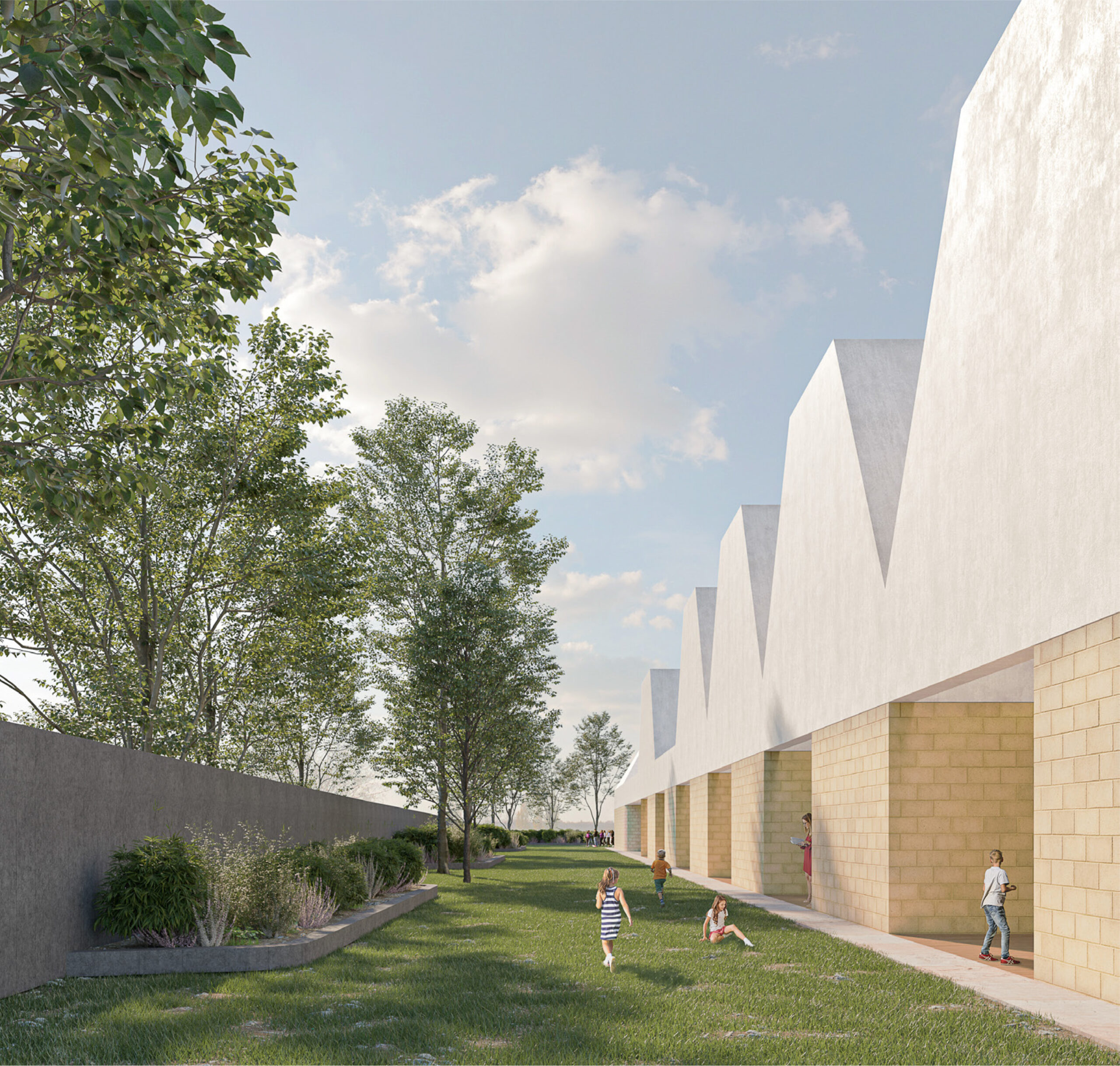Nel progetto vincitore si evidenzia come i sensi dei bambini vengono stimolati dalle ampie vetrate delle aule, dai vari rivestimenti delle superfici interne ed esterne e dalla geometria dei volumi. Grazie anche alle qualità climatiche della regione, lo spazio verde diventa uno dei luoghi di maggior utilizzo all’interno del polo infantile. Una delle modalità di apprendimento dei bambini è proprio la scoperta, e per questo la relazione con il giardino costituisce un ruolo fondamentale. Vista questa importanza, le aule sono sempre in dialogo diretto con il giardino didattico tramite delle logge coperte che proiettano gli sguardi dei bambini verso l’esterno aumentandone l’interesse, la curiosità e la voglia di scoperta.