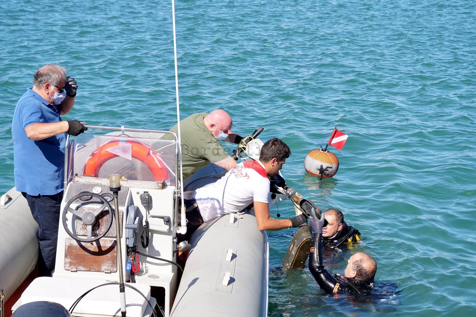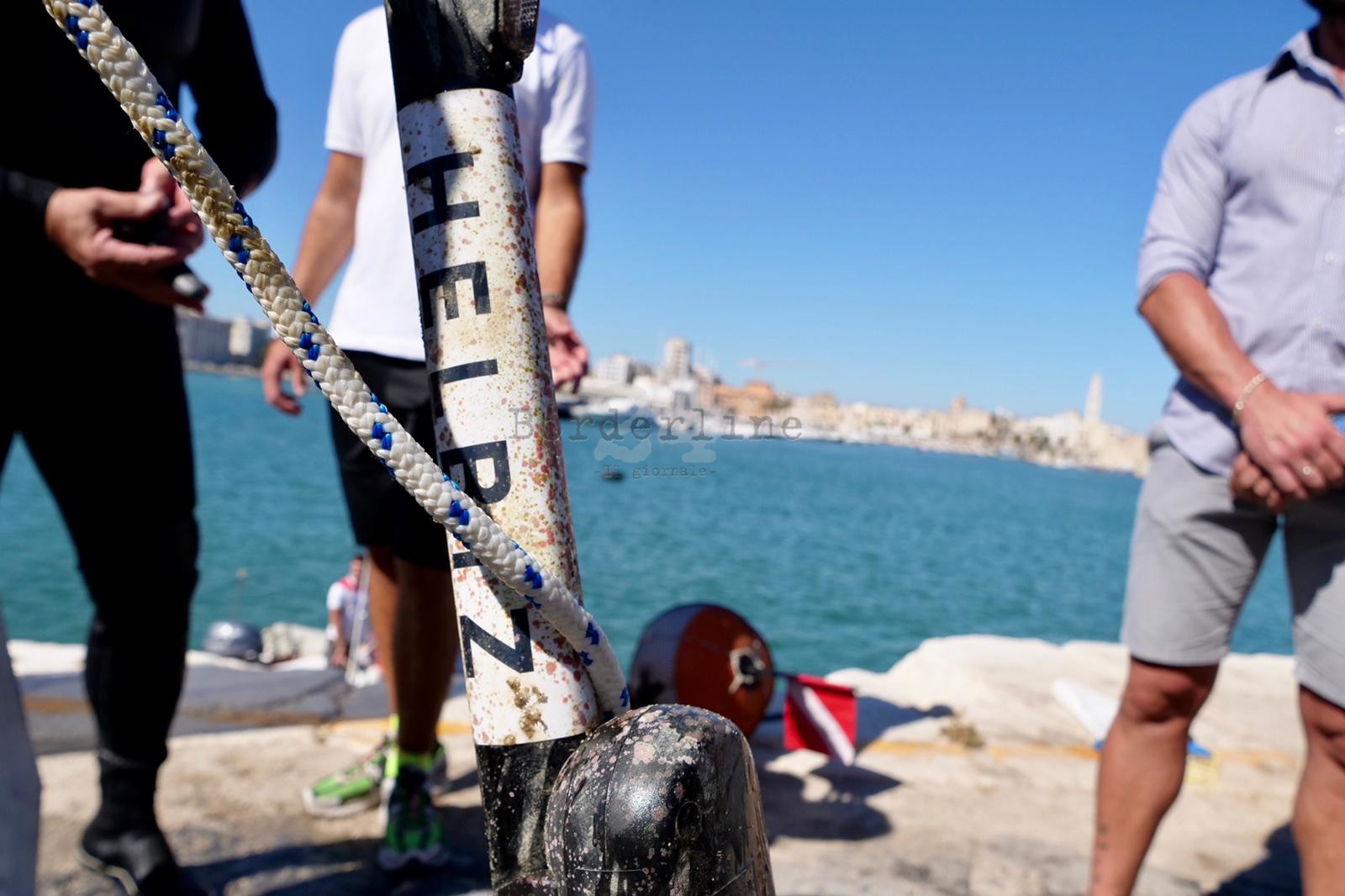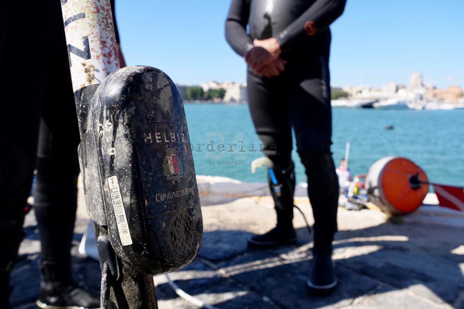 I dipendenti dell’azienda di mobilità sostenibile Helbitz avevano ricevuto l’ultimo segnale dal gps proprio nella zona del molo Sant’Antonio. Così i sub si sono immersi e hanno scandagliato il fondale con centinai di bottiglie di vetro e perfino pezzi di ciclomotori, fino a rintracciare il monopattino già in stato di degrado. Il mezzo è ormai fuori uso, tutta la componente elettrica sarà sostituita. Le alghe hanno ricoperto anche lo stemma della città (foto in basso). Clicca qui per la diretta Facebook di Borderline24 durante l’operazione.