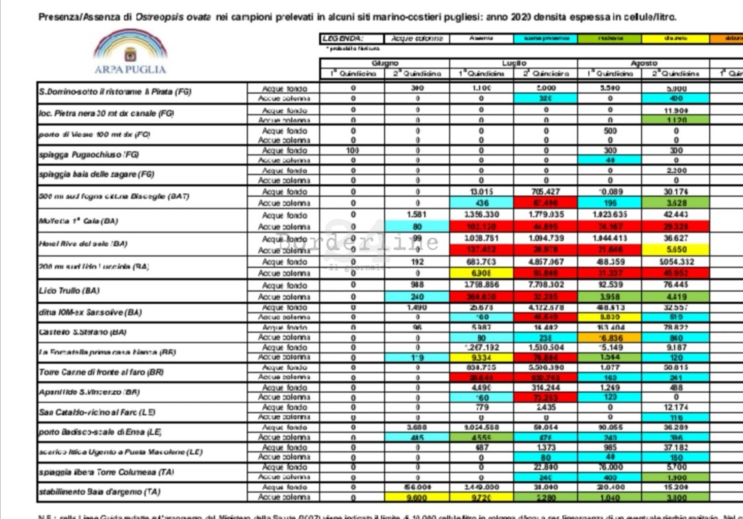 L’alga tossica non lascia le coste pugliesi. Con l’estate agli sgoccioli, le concentrazioni restano comunque elevate. Lo rivela l’ultimo bollettino dell’Arpa che riguarda il periodo dal 15 al 31 agosto. Concentrazioni da livello rosso a Molfetta e a Santo Spirito, livello lieve invece nel resto della Puglia, modesto nel Foggiano, Bisceglie e in provincia di Taranto.