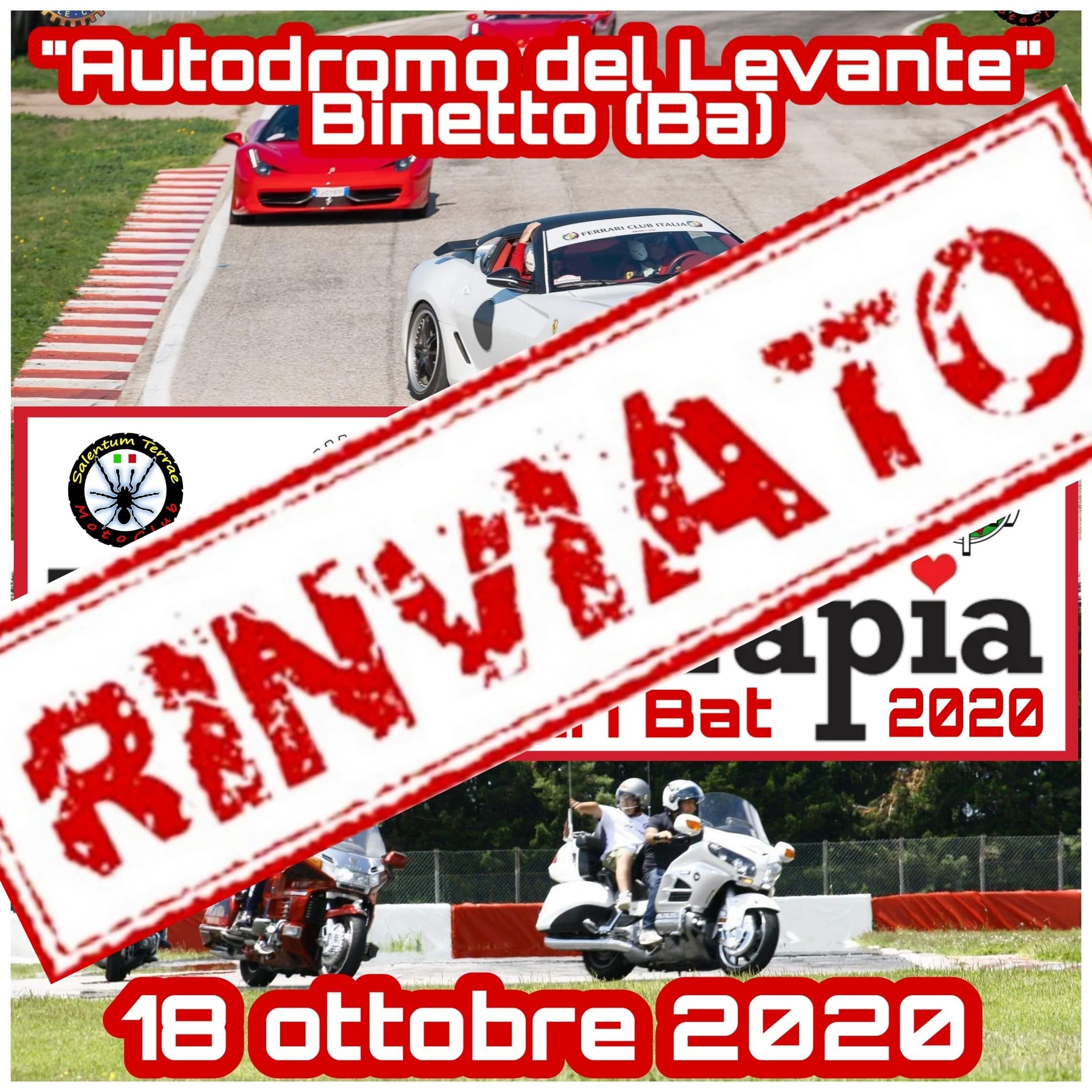 Rinviato l’evento “Motorterapia – Trofeo AC Bari Bat” previsto per domenica 18 ottobre all’autodromo del Levante di Binetto. E’ quanto comunicato da l’Ac Bari Bat e Motoclub Salentum Terrae.