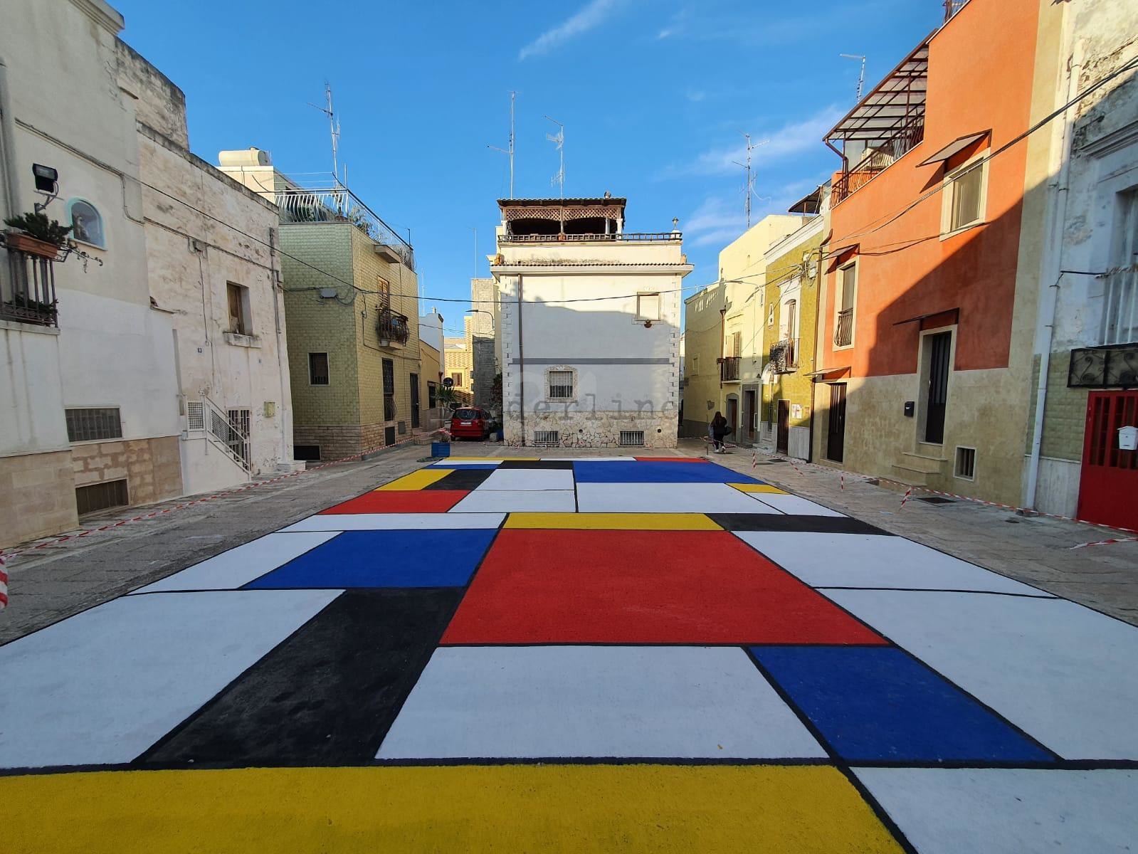 A pochi passi da piazza Garibaldi, due associazioni Bari Quarta e Voglia di Crescere hanno finanziato quest’opera ispirata all’arte del pittore olandese Piet Mondrian, fondatore del neoplasticismo nella prima metà del ‘900: quadri di colori primari tra linee perpendicolari e colori primari (rosso, giallo, blu).