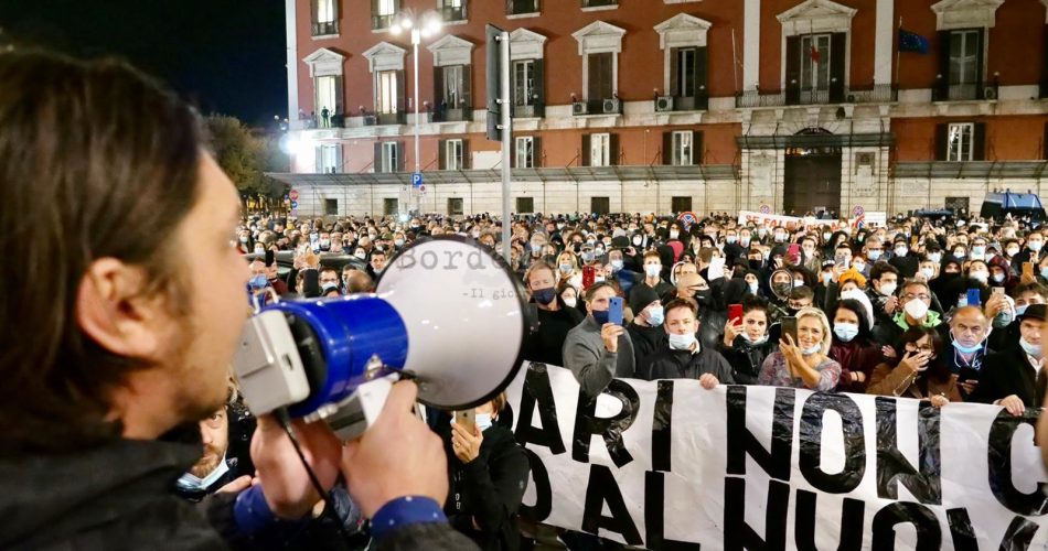 Si è conclusa una lunga giornata di manifestazioni di protesta contro la decisione del governo Conte di varare una ulteriore stretta per limitare i contagi Covid. In serata oltre 2mila persone hanno sfilato fino a piazza Prefettura, sotto il Comune di Bari. Il sindaco Antonio Decaro ha espresso il proprio ringraziamento per chi ha preso parte al sit in pacificamente.