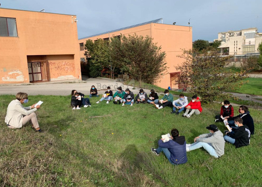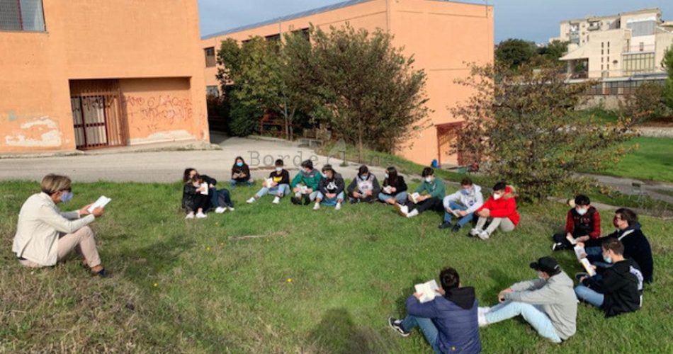 Una lezione sul prato per una classe del liceo scientifico Pietro Sette di Santeramo in Colle (Bari). È l’iniziativa del loro docente di letteratura, il professor Giancarlo Visitilli, che in tempi di didattica a distanza per l’emergenza Covid (la chiusura delle scuole in Puglia è stata decisa dalla regione una settimana fa) ha deciso di fare lezione «in presenza», seduti in cerchio sul prato vicino la scuola.