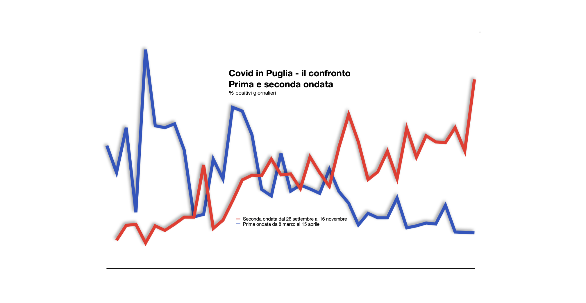 L’ultimo bollettino epidemiologico della Regione Puglia (15 novembre) mostra un dato significativo per la seconda ondata di contagi Covid: è positivo il 23,5 per cento dei tamponi effettuati in un giorno, in pratica più di uno su cinque dei 4.425 test analizzati nei laboratori Asl. Numeri oltre la media nazionale del rapporto positivi-tamponi al 17,9 per cento (uno su sei).