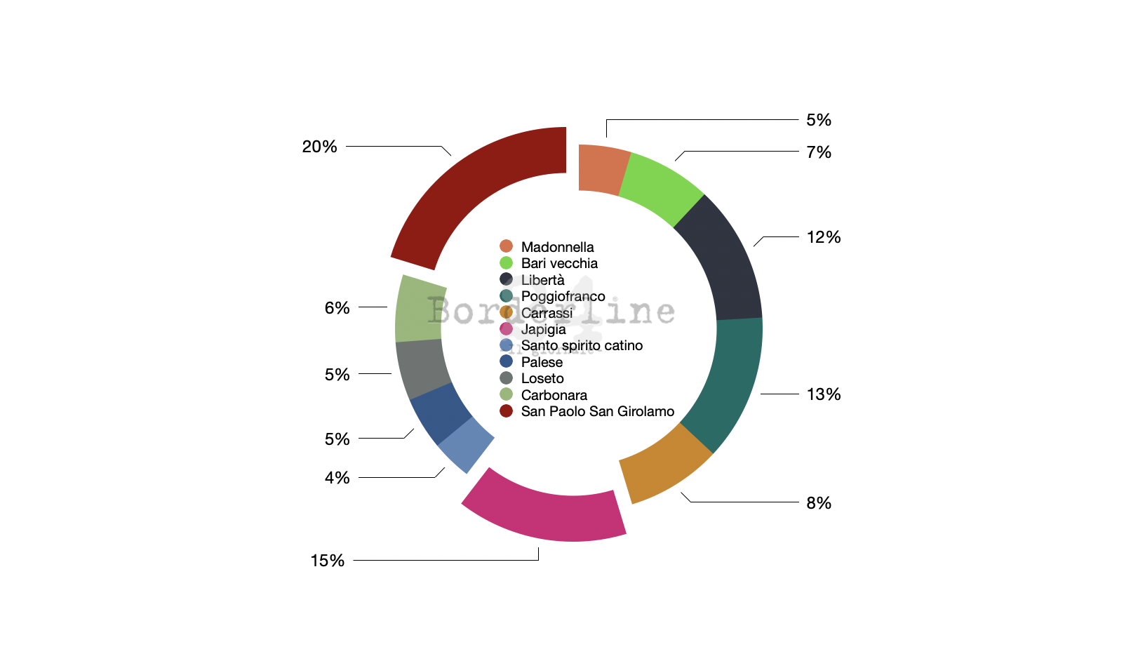 Nei singoli quartieri di Bari si conferma l’aumento dei numeri nelle zone maggiormente popolose: il 35% delle persone in isolamento al Covid risiede a San Paolo e San Girolamo (incluso Fesca e Marconi) con 651 positivi a cui si aggiungono i cittadini di Japigia (486 contagi). Segue Poggiofranco (414), Libertà (388), Carbonara (191), Palese (149), Loseto (166), Santo Spirito-Catino (114).