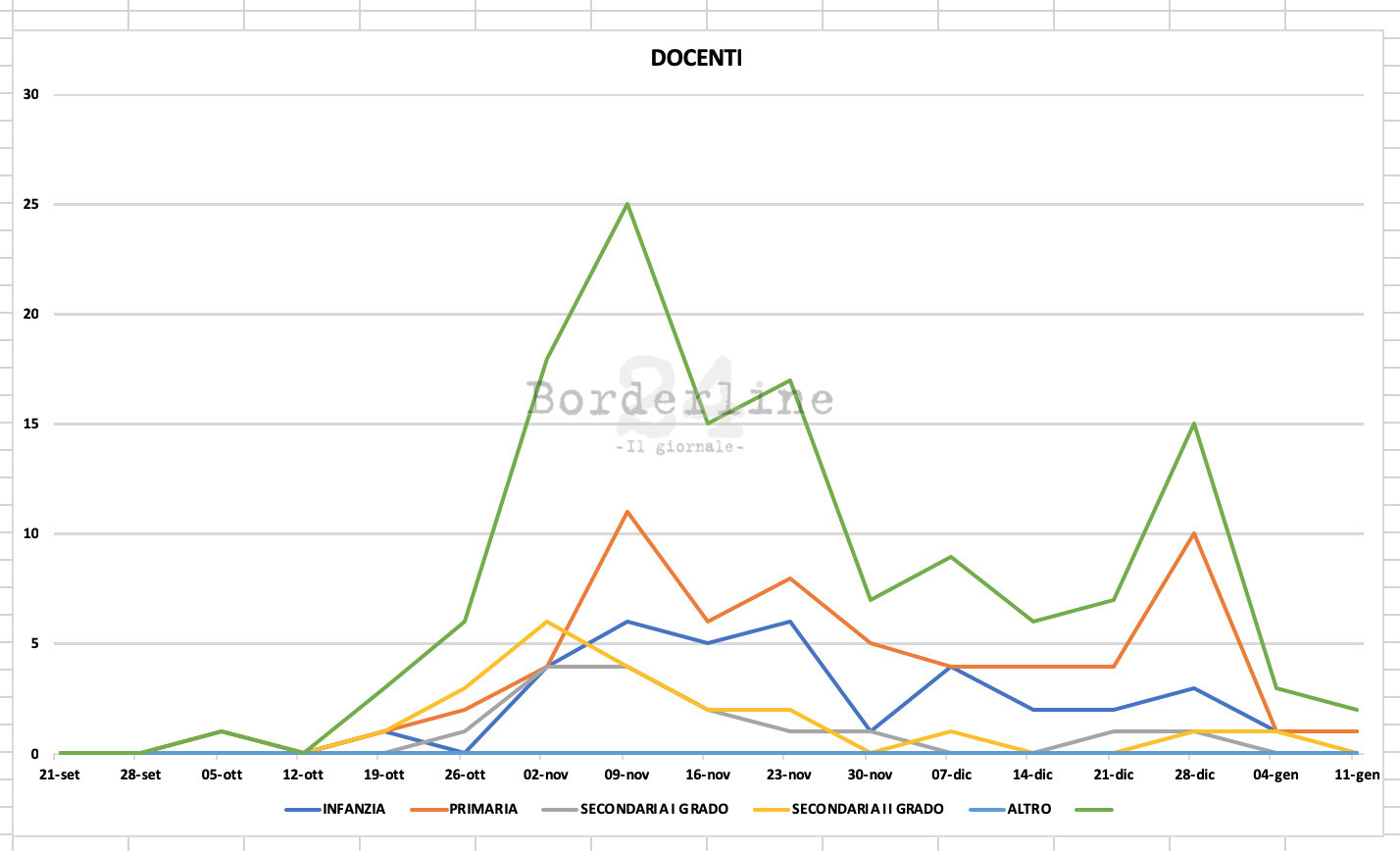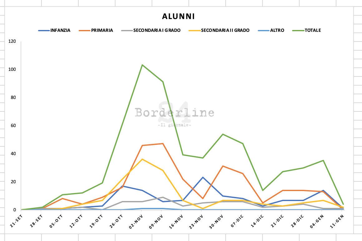 Sono in particolare le scuole superiori a far registrare il calo più vertiginoso, passando da un andamento che dal 28 settembre al 2 novembre è in continuo aumento ad uno sviluppo regolare nelle settimane successive fino ad abbassarsi a partire dal 23 novembre e mantenersi stabile fino ad oggi.