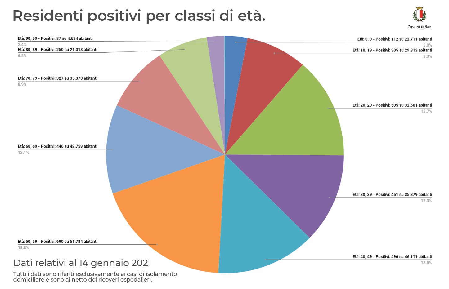Osservando la curva epidemiologica cittadina dal 9 settembre 2020 al 14 gennaio 2021, si nota un costante incremento dei contagiati Covid tra i più giovani, soprattutto la fascia d’età compresa tra i 20 e i 29 anni: sono il 13,7% (505 su 32.601 abitanti). Nel corso delle settimane i positivi 20-29 anni hanno raggiunto i cittadini ammalati di Covid tra i 30-39 anni (sono 451 su 35.379 residenti, il 12,3%). La categoria più esposta al contagio resta quella tra i 50-59 anni, di cui positivi 690 su 51.784 abitanti (il 18,8%).