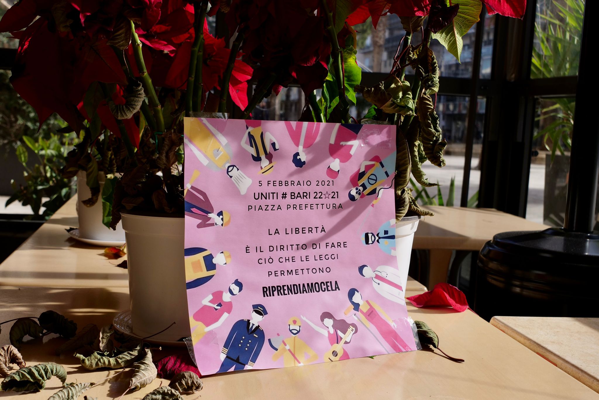 Associazioni e partite iva scendono in piazza a Bari per il diritto al lavoro e annunciare la protesta del 14 febbraio, nel giorno di San Valentino. “Apro il mio ristorante, con le stesse normative igienico sanitarie e di prevenzione dal virus”, si legge sui cartelli affissi in numerose attività, dal centro alle periferie, con riferimento sulla disparità rispetto ad hotel e autogrill.
