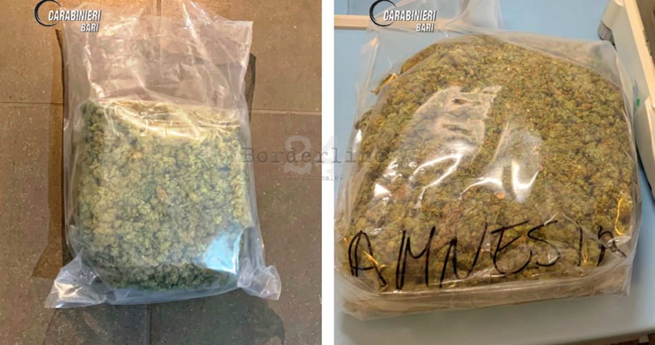 L’uomo, già noto alle forze dell’ordine, è stato fermato dai Carabinieri alla guida della propria autovettura in via Ammiraglio Vacca di Bitonto. La presenza dello stesso a Bitonto e i segni di nervosismo che mostrava hanno insospettivo i militari che hanno pertanto deciso di procedere a un controllo più accurato del mezzo. Nel corso della perquisizione i Carabinieri hanno rinvenuto, nel bagagliaio dell’autovettura, una busta in plastica contenente oltre 1 chilo di marjuana.