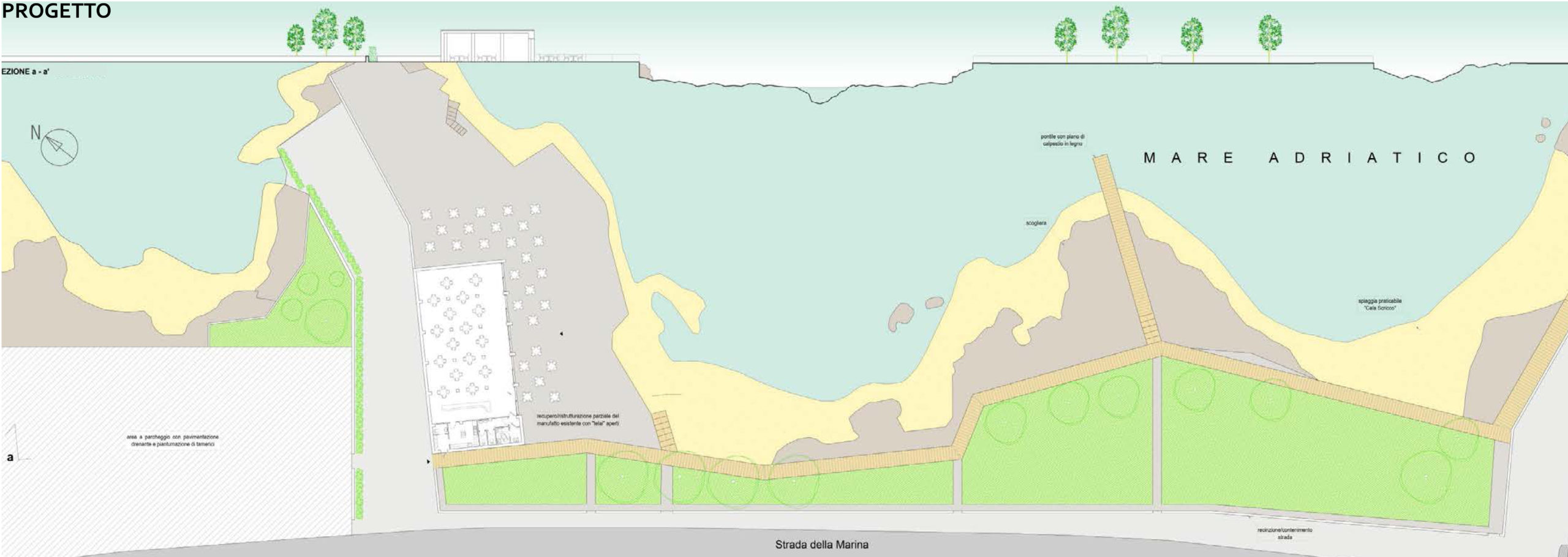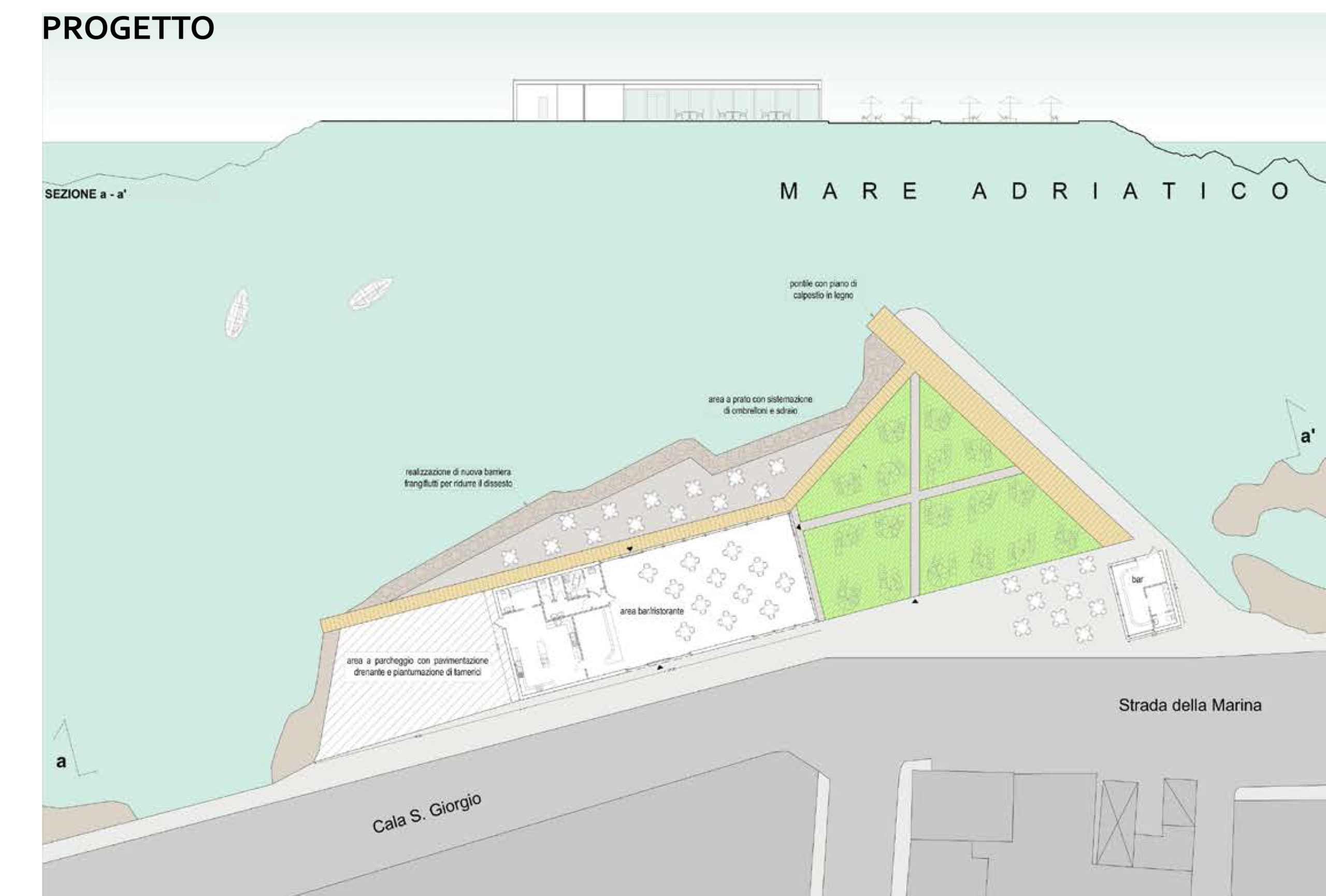 Il progetto prevede la riperimetrazione del sito, al fine di “rettificare” la sezione stradale prospiciente ospitando il marciapiede e la pista ciclabile senza soluzione di continuità rispetto al resto del litorale. La proposta consiste nello smantellamento delle costruzioni esistenti, ormai irrecuperabili e nella realizzazione di nuova volumetria che non ecceda il volume legittimo attuale.
