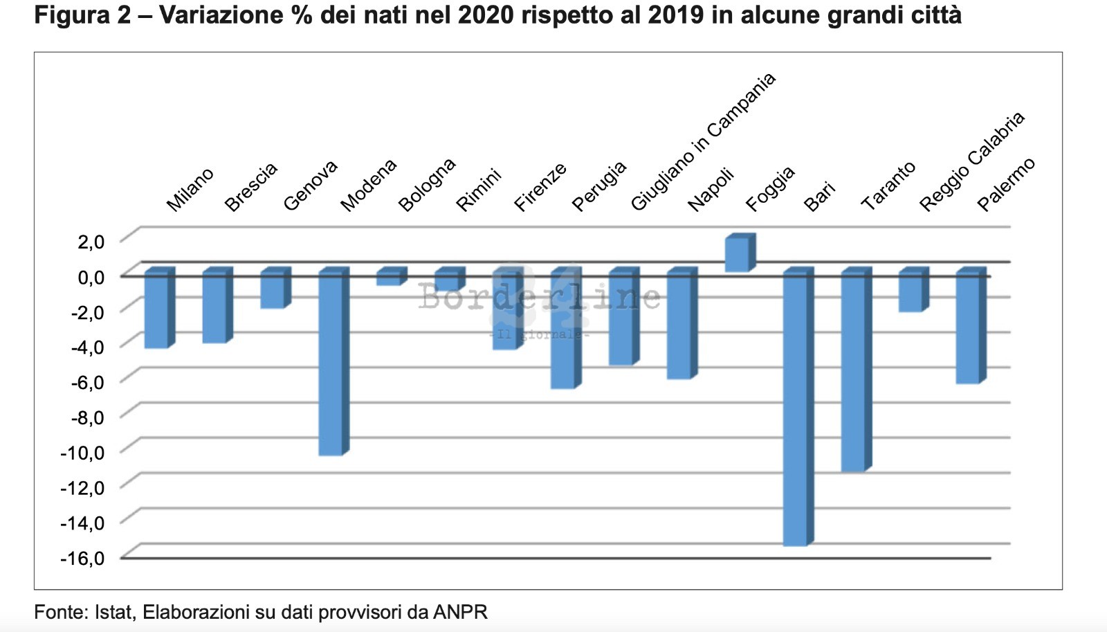 La variazione dei nati nel 2020 rispetto al 2019 interessa anche la città di Bari che a livello nazionale ottiene il dato peggiore: la caduta dei concepimenti si attesta a quasi -16%, seguita da Taranto al secondo posto (-12%) e Modena (-10%). Il divario del capoluogo pugliese con altre metropoli è notevole, Milano si attesta al -4% mentre Napoli è al -6% (grafico in basso).