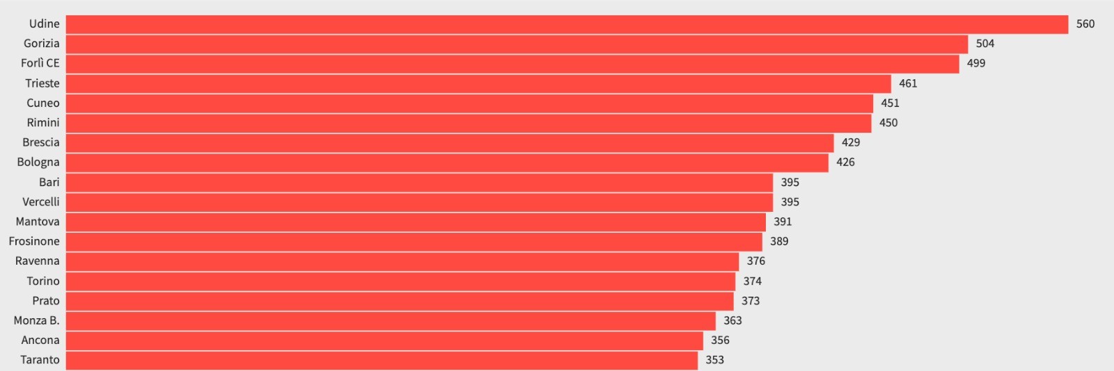Bari è la prima provincia del Sud, mentre su scala nazionale risulta all’ottava posizione della graduatoria: in testa c’è Udine (con 560), seguono Gorizia (504) e Forlì (499). Davanti a Bari, c’è la provincia di Bologna (426), invece poco più in basso c’è Taranto (353). Nel frattempo continua ad essere elevata la pressione dei pazienti affetti da coronavirus che richiedono assistenza sanitaria, alle prese con il peggiorare dei sintomi (difficoltà respiratorie e febbre alta). Al pronto soccorso del Policlinico di Bari – ore 9.02 – i pazienti in visita sono 55 di cui 6 in codice rosso e 39 in arancione.