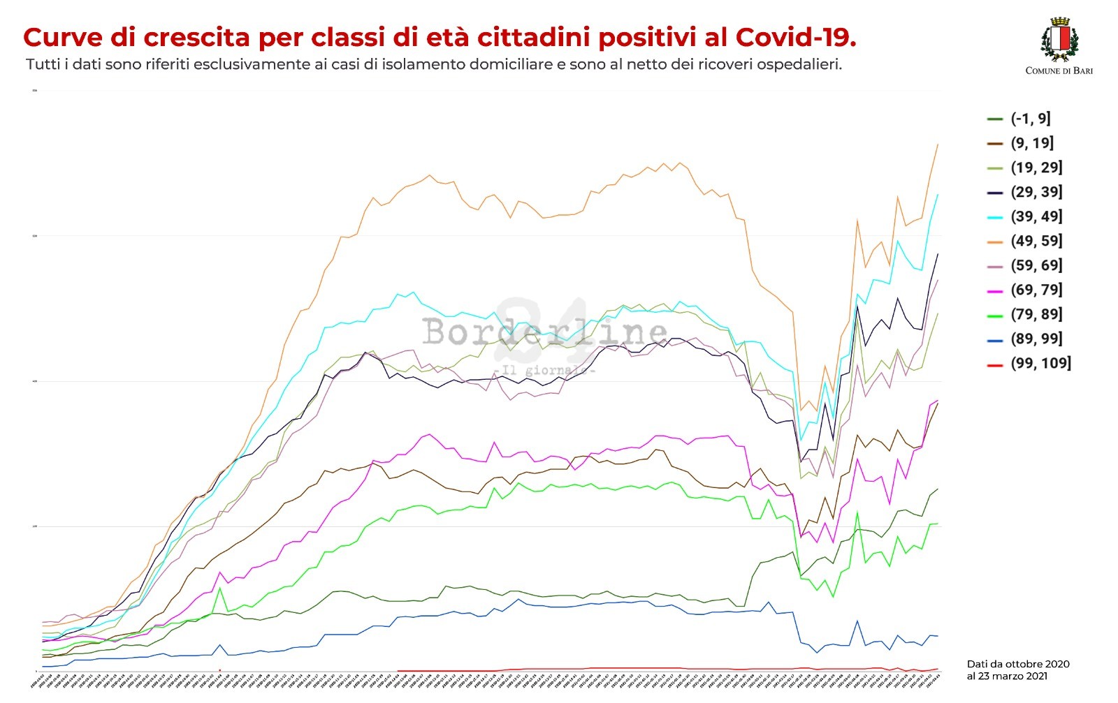 La terza ondata su Bari dura da oltre un mese. il periodo più difficile dall’inizio della pandemia Covid, peggio perfino del picco di dicembre. Secondo i dati pubblicati sul sito del Comune, dallo scorso 22 febbraio il numero dei positivi al virus in città è raddoppiato, passando da 2.185 casi accertati agli attuali 4.248 (ultimo aggiornamento 23 marzo).