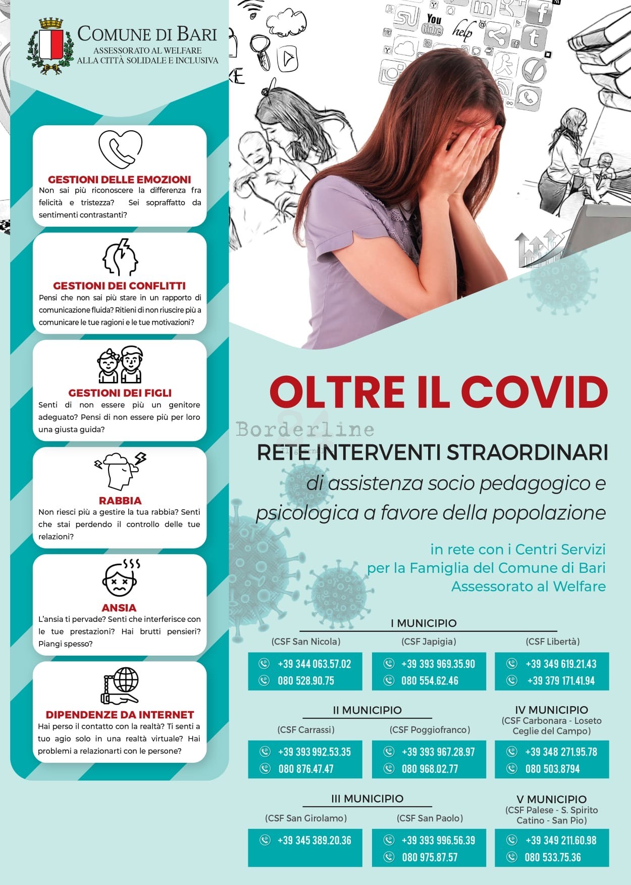 Il progetto Oltre il covid nasce proprio per dare un ulteriore supporto psicologico ed emotivo e contrastare le solitudini a quanti si sentono oppressi, in crisi profonda rispetto al momento storico che stiamo vivendo e alle trasformazioni della nostra quotidianità subite a causa della pandemia”.
