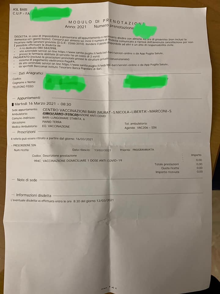 Un appuntamento per la somministrazione del vaccino domiciliare al quale nessuno si è mai presentato. E’ quanto accaduto ad una cittadina barese. A denunciarlo la figlia della donna che nelle scorse ore ha pubblicato sulla bacheca del governatore della Puglia, Michele Emiliano, il modulo di prenotazione in questione della Asl Bari. In particolare, lo scorso 13 febbraio, la donna, tramite il supporto della figlia, aveva prenotato il vaccino domiciliare ricevendo un appuntamento per il 16 marzo per la prima dose.