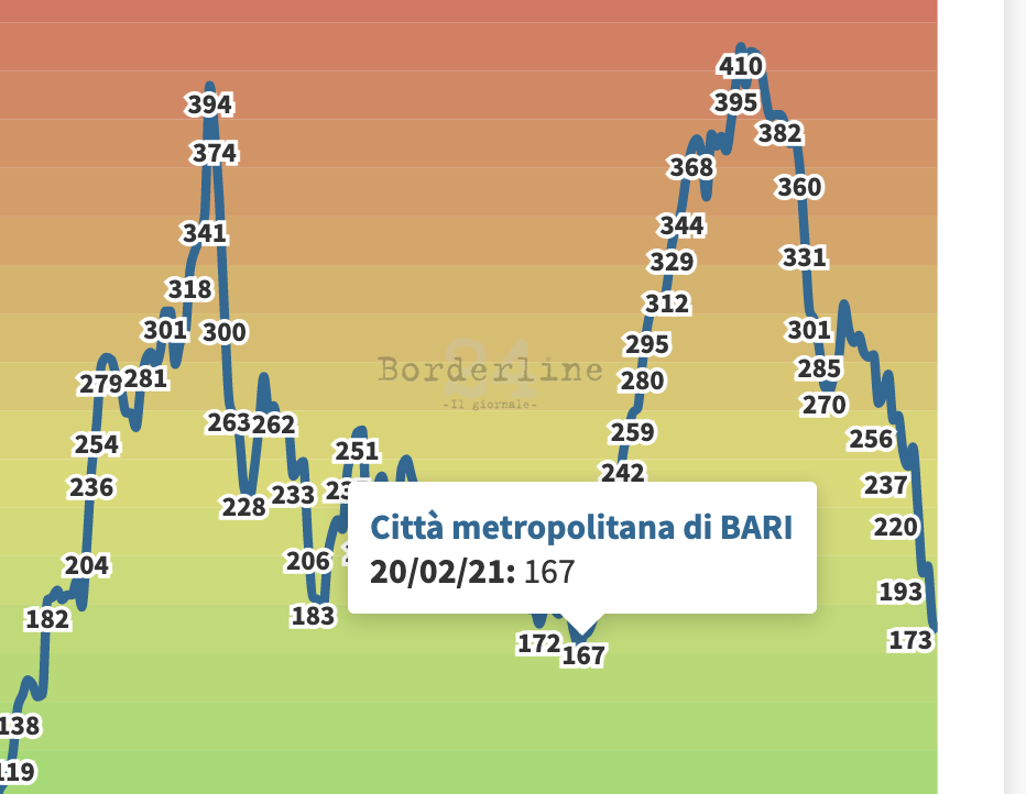 Anche tutta la provincia di Bari conferma l’andamento verso la fine del periodo più difficile dall’inizio della pandemia. Dopo aver occupato le posizioni alte della classifica nazionale sull’incidenza (il numero di contagi ogni 100mila abitanti), la città metropolitana tocca quota 169. Il limite da zona rossa del governo Draghi è stato fissato a 250, nel Barese il dato è stato ampiamente superiore con il picco registrato di 410 lo scorso 24 marzo. La Bat invece occupa la prima posizione su 107 province. Numeri così bassi come la metà di febbraio.