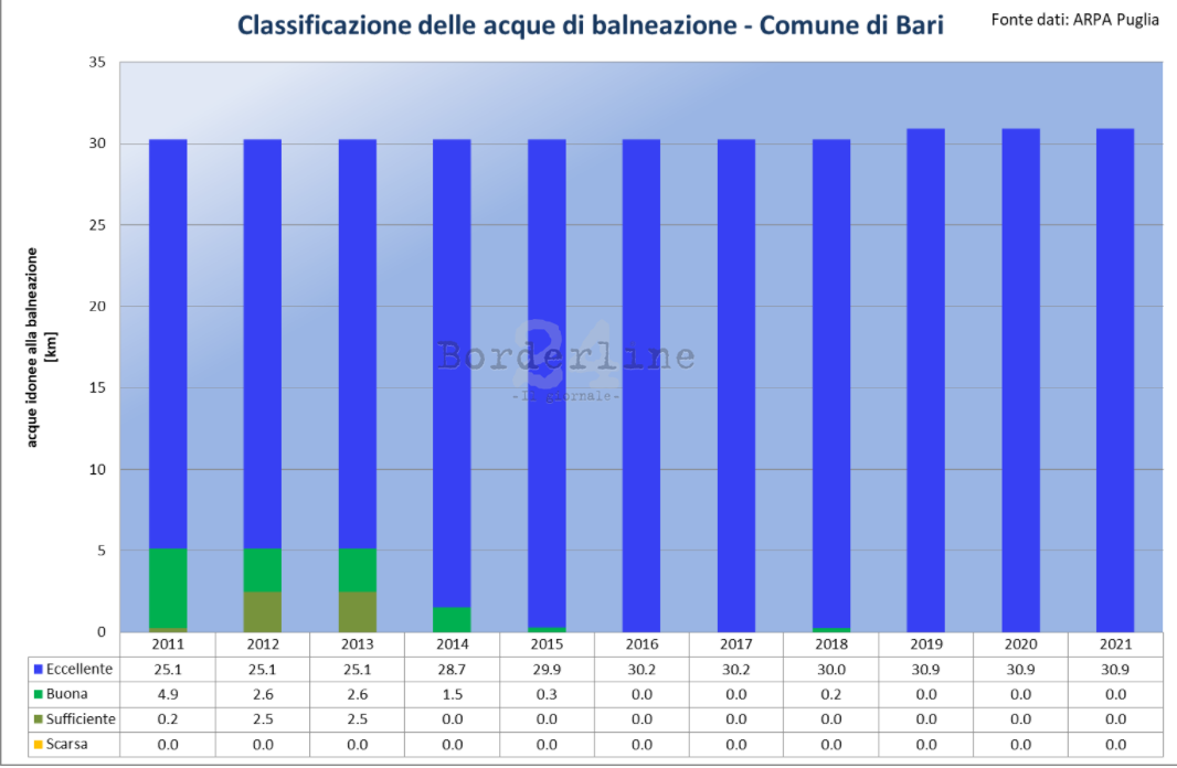 “Per la città di Bari è una grandissima soddisfazione poter contare su 42 chilometri di costa sicuri da un punto di vista igienico-sanitario, tanto più se la valutazione è ovunque eccellente per qualità dell’acqua – commenta l’assessore Pietro Petruzzelli -. Un risultato ormai consolidato nel tempo, visto che le analisi di Arpa Puglia certificano un livello eccellente del nostro mare per il terzo anno consecutivo. Questa attestazione, per noi tutti, è molto incoraggiante da tanti punti di vista: prima di tutto perché l’amministrazione comunale, sin dallo scorso mandato, ha puntato molto sulla ricostruzione del rapporto tra la città e il suo mare, e poi perché ci auguriamo che, a pochi giorni dall’apertura della stagione estiva, questo sia un ulteriore motivo per attrarre i flussi turistici. Senza dimenticare che un’ottima qualità delle acque può contribuire a dare nuova linfa alle attività sportive nautiche che, come tutti gli sport, hanno dovuto subire un inevitabile rallentamento a causa dell’emergenza sanitaria”.