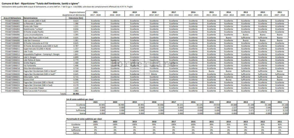 “Per la città di Bari è una grandissima soddisfazione poter contare su 42 chilometri di costa sicuri da un punto di vista igienico-sanitario, tanto più se la valutazione è ovunque eccellente per qualità dell’acqua – commenta l’assessore Pietro Petruzzelli -. Un risultato ormai consolidato nel tempo, visto che le analisi di Arpa Puglia certificano un livello eccellente del nostro mare per il terzo anno consecutivo. Questa attestazione, per noi tutti, è molto incoraggiante da tanti punti di vista: prima di tutto perché l’amministrazione comunale, sin dallo scorso mandato, ha puntato molto sulla ricostruzione del rapporto tra la città e il suo mare, e poi perché ci auguriamo che, a pochi giorni dall’apertura della stagione estiva, questo sia un ulteriore motivo per attrarre i flussi turistici. Senza dimenticare che un’ottima qualità delle acque può contribuire a dare nuova linfa alle attività sportive nautiche che, come tutti gli sport, hanno dovuto subire un inevitabile rallentamento a causa dell’emergenza sanitaria”.