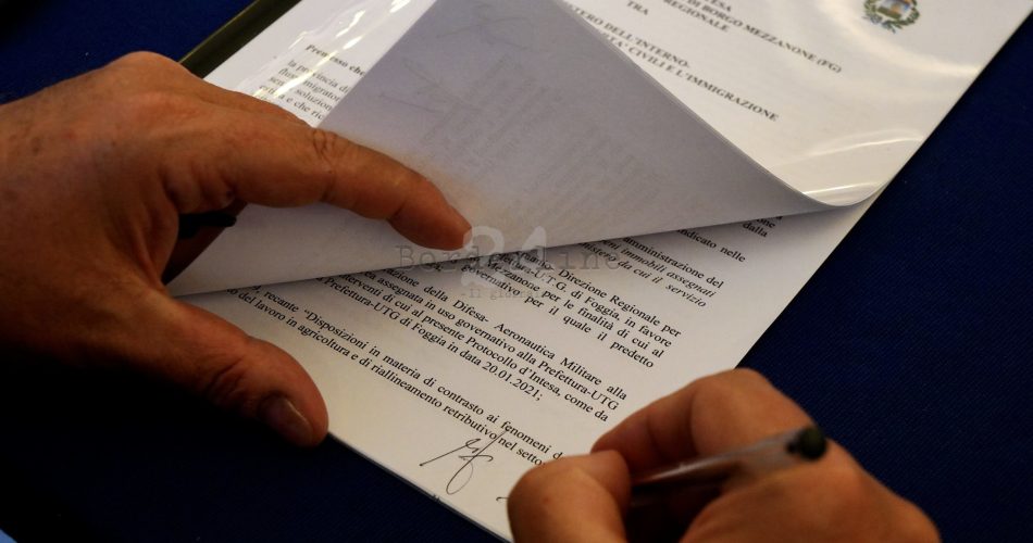 A Foggia, presso il palazzo della Prefettura, il presidente della Regione Puglia Michele Emiliano, insieme con il vicepresidente Raffaele Piemontese, ha sottoscritto il protocollo d’intesa per la riconversione del C.A.R.A. di Borgo Mezzanone in foresteria regionale con il Ministero dell’interno – Dipartimento per le libertà civili e l’immigrazione e la Prefettura di Foggia. Hanno partecipato anche Roberto Venneri, segretario generale della Presidenza della Regione Puglia e Domenico De Giosa dirigente della sezione sicurezza del cittadino, politiche per le migrazioni e antimafia sociale della Regione.