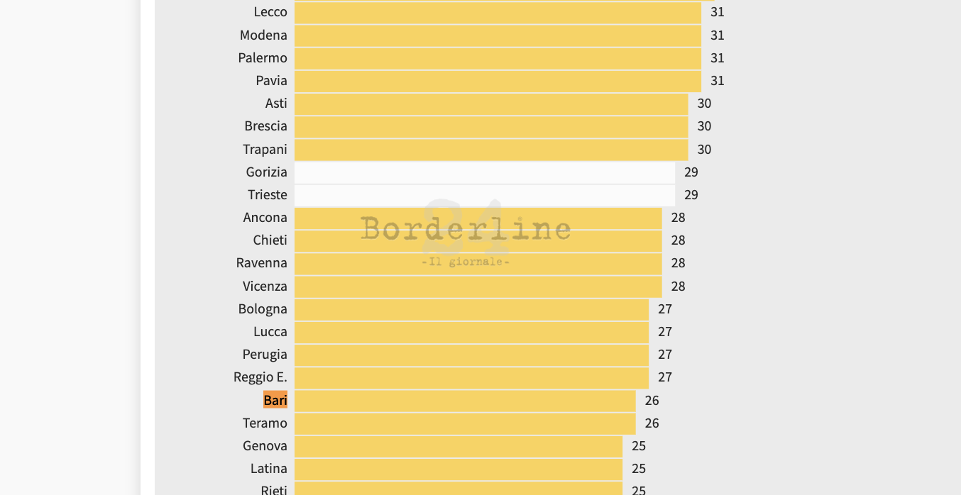 Gorizia e Trieste, da lunedì in zona bianca, fanno registrare più contagi della città metropolitana di Bari (in zona gialla come il resto della regione). Nel dettaglio, come mostra la rilevazione Gimbe – qui il link – le due due province del Friuli-Venezia Giulia si attestano nella classifica nazionale dell’incidenza Covid (contagi ogni 100mila abitanti) rispettivamente a quota 29, mentre poche posizioni più in basso il capoluogo pugliese raggiunge incidenza 26.