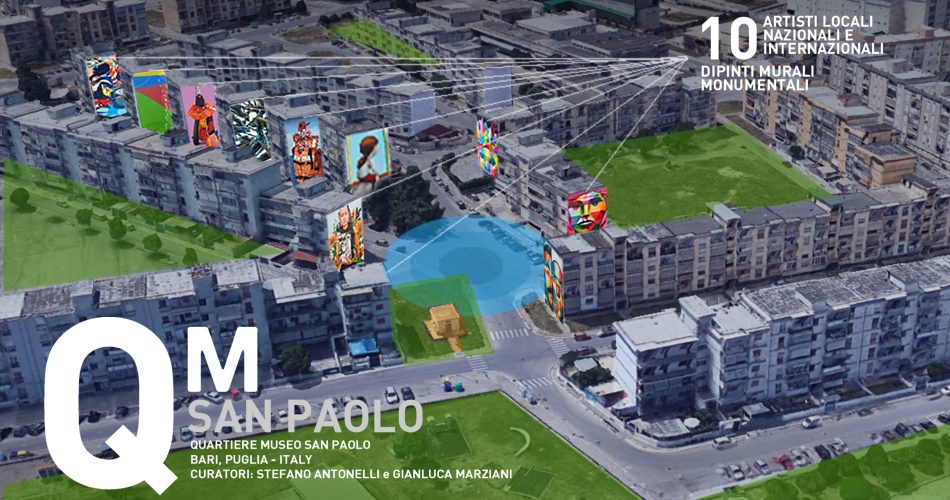 QM – Quartiere museo San Paolo è un progetto che nasce dall’intenzione del Comune di Bari di avviare un percorso di rigenerazione dei luoghi attraverso l’utilizzo dell’arte urbana intesa come strumento di bellezza che può migliorare il contesto urbano e stimolare maggiore senso di appartenenza della comunità coinvolta nel processo di definizione delle opere, realizzate a cura di artisti internazionali, nazionali e locali. Questo intento, condiviso con la Fondazione Mecenate 90, si è presto trasformato nel progetto QM San Paolo che ha visto il finanziamento della Regione Puglia nell’ambito delle politiche di promozione della street art urbana e la collaborazione di Arca Puglia Centrale, che metterà a disposizione del programma di rigenerazione una serie di immobili di sua proprietà ubicati nel quartiere San Paolo.