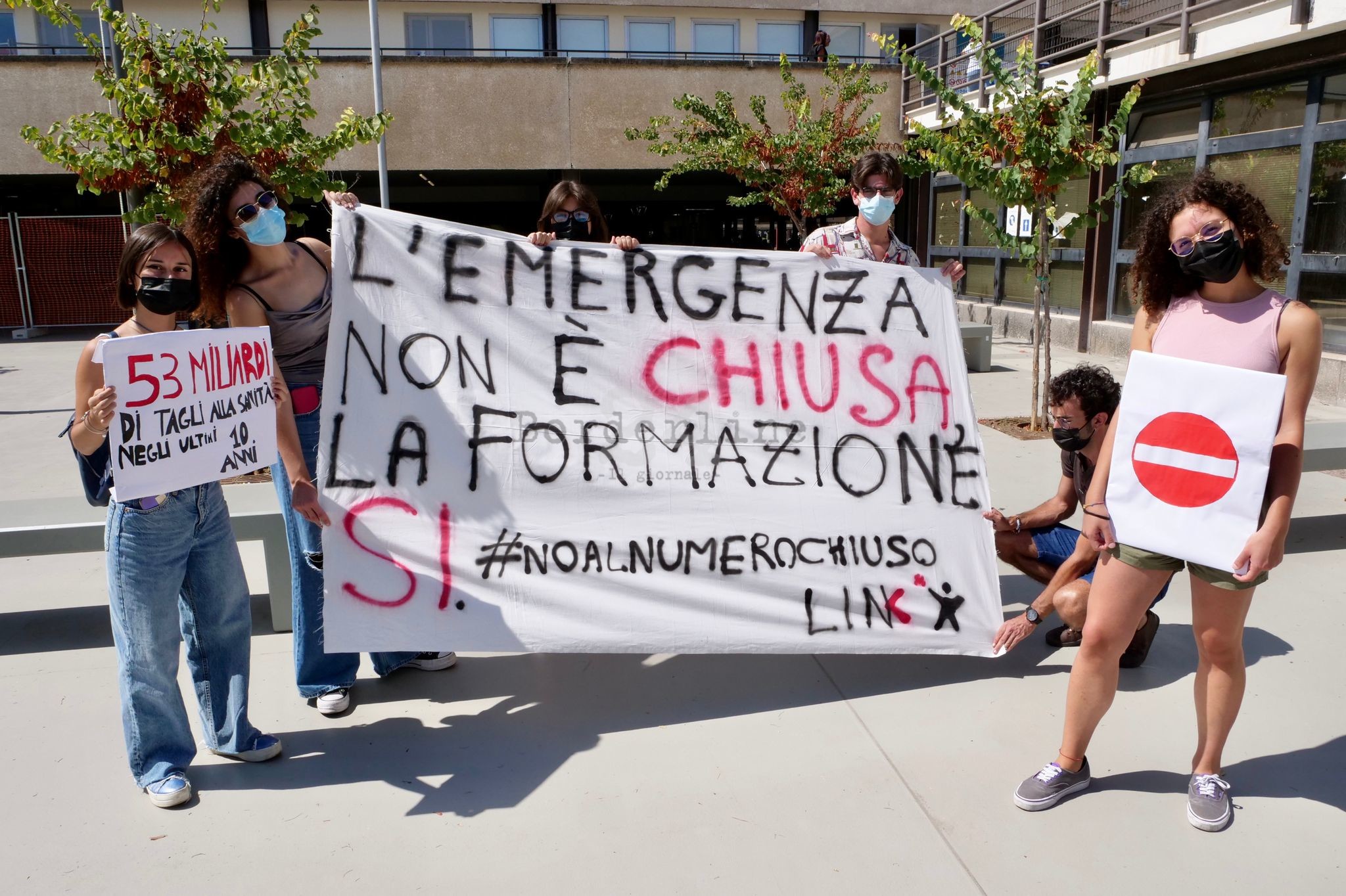 “L’emergenza non è chiusa. La formazione sì”. Recitano così i cartelli esposti, a margine all’ingresso dei plessi in cui si stanno svolgendo le prove, dai rappresentanti dell’associazione studentesca Link, che manifestano in favore dell’abolizione del numero chiuso per l’accesso ai corsi di Laurea.