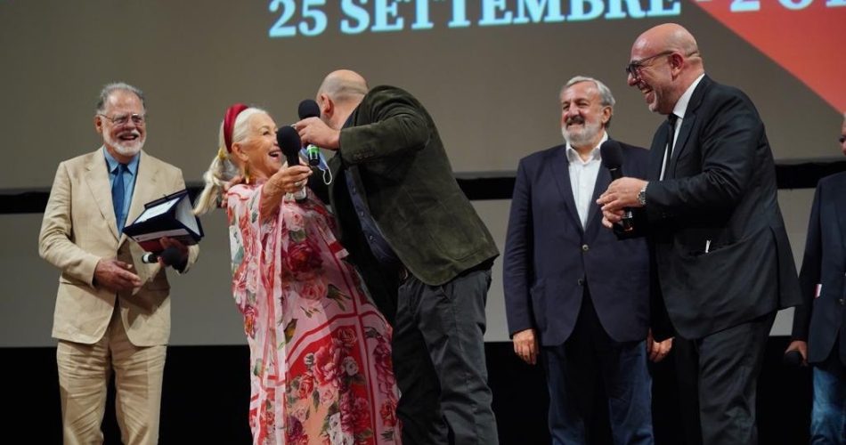 “Questa sera il premio Fellini viene consegnato a una regina – si legge nelle motivazioni del Federico Fellini Platinum Award for Cinematic Excellence a Helen Mirren – L’attrice che lo riceve, nella sua lunga carriera di una ricchezza indescrivibile, ha interpretato più regine di chiunque altra, sullo schermo e sul palcoscenico, ed è diventata in questi anni persino la regina della Puglia, che ha contributo a far crescere con la sua presenza magica, il suo sguardo pieno d’amore e la luce del suo sorriso. Ma come si fa a premiare una regina? Qualunque cosa si dica, si rischia di sembrare irriverenti. E d’altra parte non si può nemmeno usare l’ironia, perché l’attrice di cui stiamo parlando è regina anche di ironia. Possiamo soltanto dire che questa meravigliosa attrice ha vissuto sullo schermo forse più vite di chiunque altra, ed è stata sempre diversa da chiunque altra”.