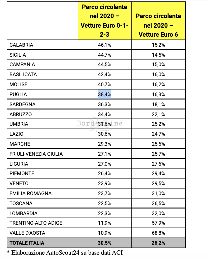 La situazione del parco circolante. Secondo gli ultimi dati dell’ACI relativi al 2020, in Italia il 30,5% delle auto è una Euro 0-1-2-3, mentre solo il 26,2% è una Euro 6. Le regioni con la percentuale più alta di vetture “datate” (Euro 0-1-2-3) sono la Calabria (46,1%), la Sicilia (44,7%) e la Campania (44,5%), mentre le più virtuose sono la Valle d’Aosta (10,9%) e il Trentino–Alto Adige (11,9%). Male la Puglia a 38,5%, peggio della media nazionale.