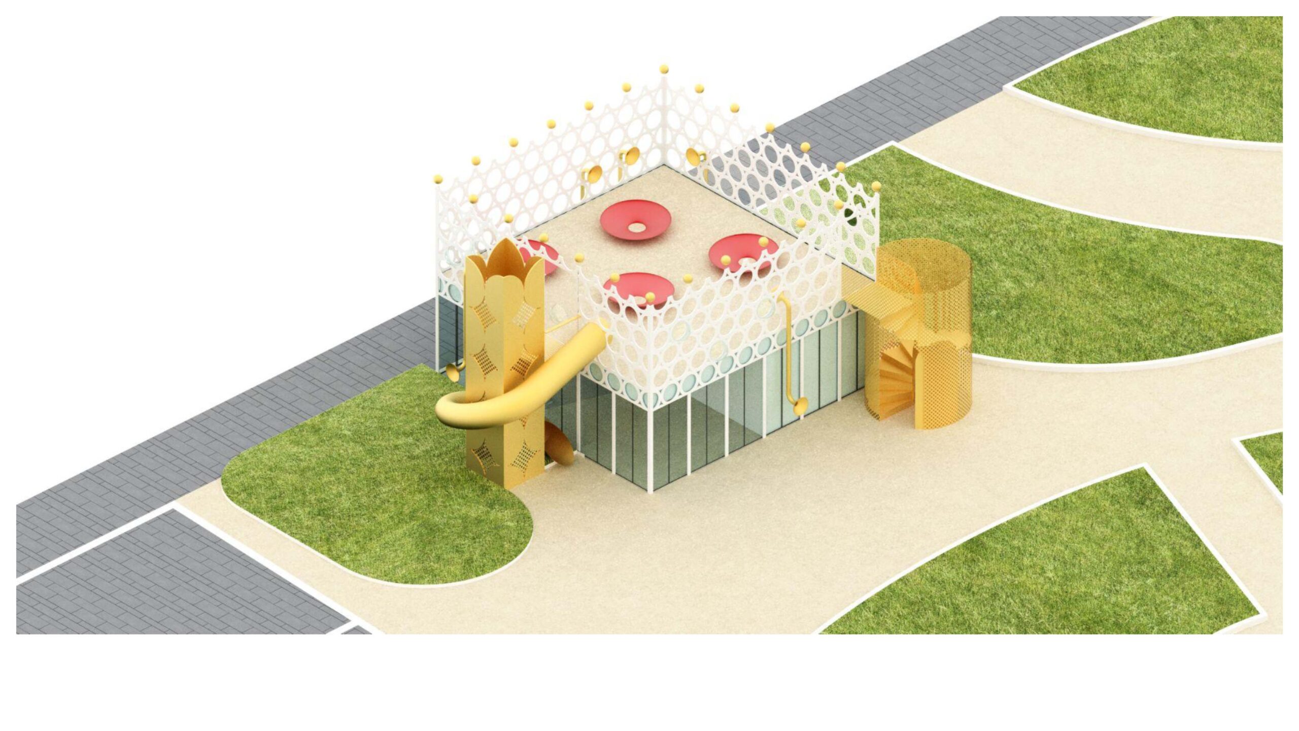 Contemporaneamente si interverrà sulla riorganizzazione della struttura relativa ai servizi igienici pubblici, ormai fatiscente e priva di alcuna rilevanza storica, che sarà interamente demolita per essere ricostruita in maniera diversa ed ospitare nuove funzionalità. Sarà, infatti, realizzata una struttura dotata anche di un piccolo spazio commerciale, adiacente al nuovo blocco servizi, così da condividerne la gestione e da ottenere un miglior aspetto dell’area. Nella fattispecie la struttura sarà realizzata in acciaio e cristalli e costituirà un “play-bar” perfettamente integrato con l’area giochi, che proseguirà in continuità fino al secondo blocco presente sulla piazza, rappresentato dalla ex Goccia del Latte.