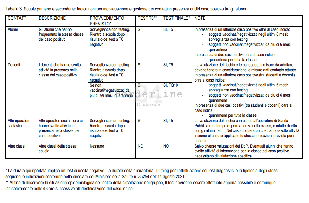 La principale novità è rappresentata dal fatto che i «contatti scolastici» sono sottoposti, secondo tali indicazioni, a sorveglianza con testing e devono, dunque, effettuare test diagnostici con le tempistiche indicate nel documento tecnico (allegato al termine dell’articolo) e predisposte dal DdP: se il risultato è negativo possono rientrare a scuola. Sono tempistiche diverse in base agli ordini di scuola.