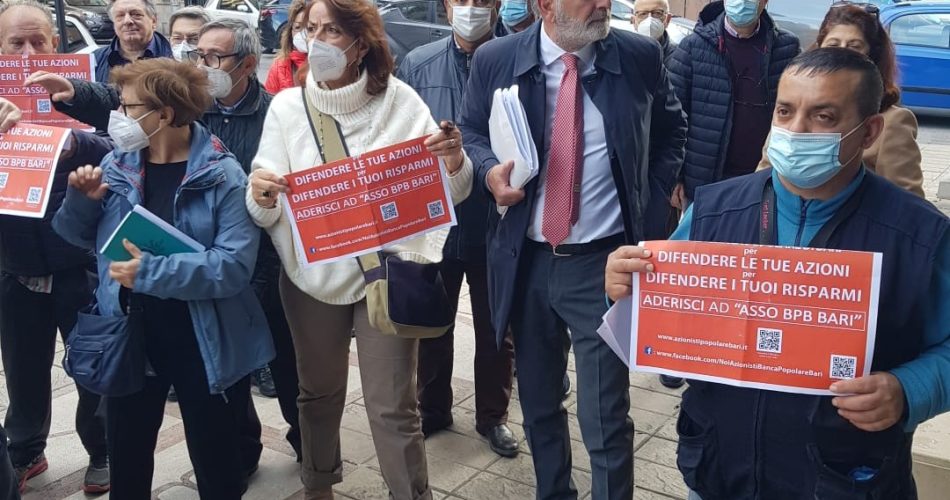 Manifestazione ieri davanti alla Banca Popolare di Bari in corso Cavour, promossa dalle associazioni e dai comitati dei soci della Popolare di Bari, per presentare la proposta normativa predisposta per ristorare 70mila soci della Popolare di Bari. Una proposta che prevede un emendamento alla legge di Bilancio 2022 che le associazioni e i comitati chiedono ai senatori pugliesi di presentare e fare approvare.