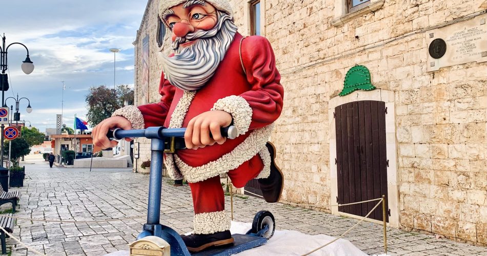 Alto 5,5 metri, al passo con i tempi, all’insegna della sostenibilità, interamente realizzato in cartapesta. È il Babbo Natale in sella al monopattino che è giunto a Putignano e ha “trovato casa” in corso Umberto I, nei pressi del Teatro Comunale. Con un sacco pieno dei primi doni sulla spalla e una cassetta postale perché grandi e bambini possano imbucare la loro letterina a lui destinata.