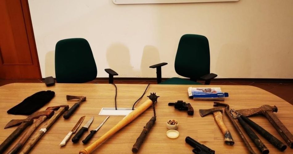 L’ispezione è stata pertanto estesa ad una villetta estiva nella disponibilità del predetto, situata nelle vicinanze del posto ove è avvenuto il controllo, all’interno della quale sono state rinvenute 2 pistole, una a tamburo e una scacciacani, unitamente a 56 cartucce a salve, tutte illecitamente detenute, nonché altri 2 coltelli e 9 armi “bianche” di varia tipologia, tra le quali una mazza con palla di ferro chiodata ed una mazza con catena per arti marziali.