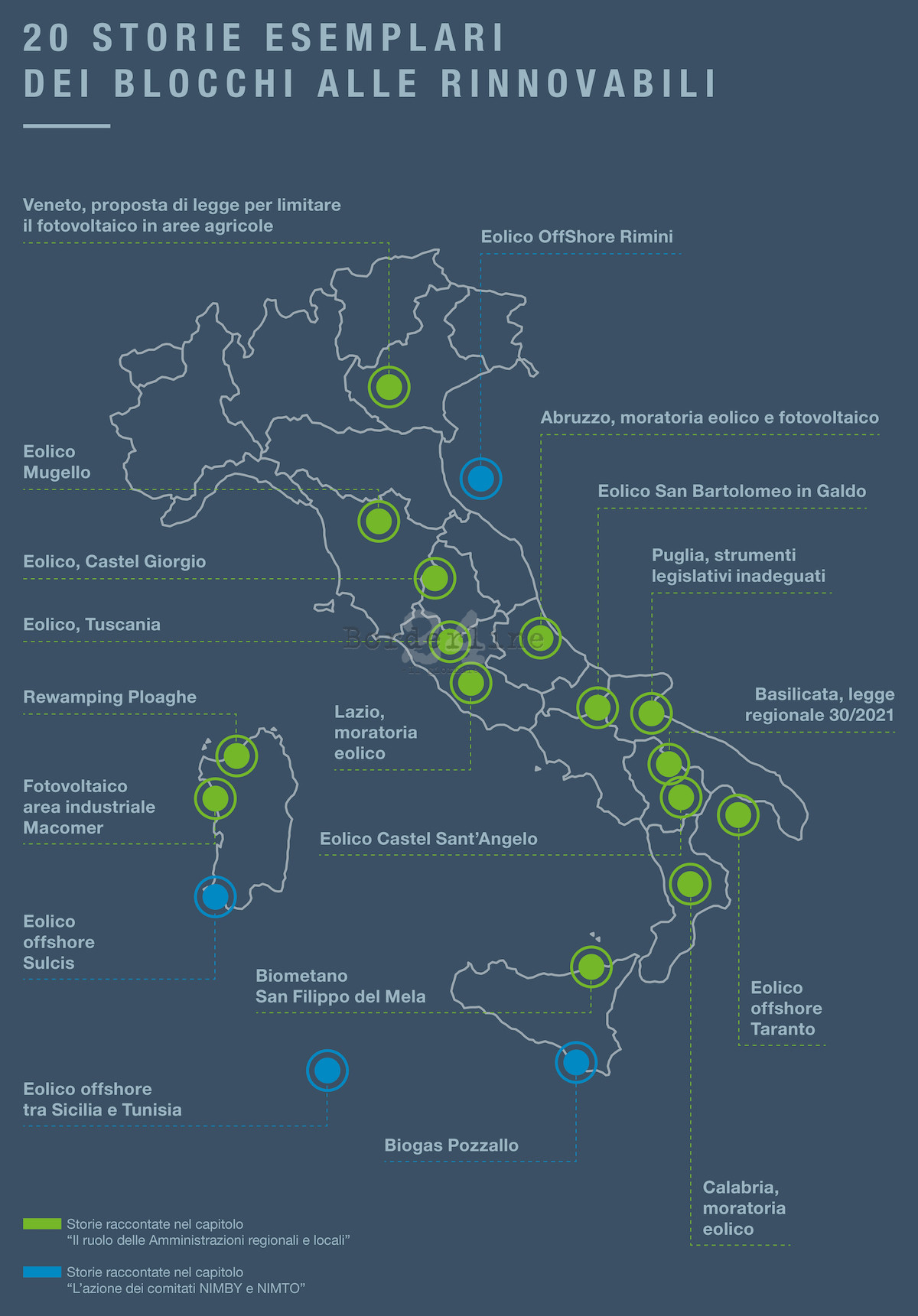 Criticità e Proposte: Nel report Legambiente ricorda che tra le prime criticità che investono lo sviluppo delle fonti rinnovabili, nel nostro Paese, c’è la mancanza di un quadro normativo unico e certo in grado di mettere ordine e di ispirare le decisioni di tutti gli attori coinvolti nei processi di valutazione e autorizzativi. Il principale riferimento è il Decreto Interministeriale del 10 settembre 2010, emanato dal Ministero dello Sviluppo Economico di concerto con il Ministero dell’Ambiente (ora Ministero della Transizione Ecologica) e il Ministero per i Beni e le Attività Culturali. Un testo che ha ormai quasi 12 anni e risulta obsoleto rispetto a quanto è cambiato non solo in termini di conoscenze delle diverse tecnologie ma anche di innovazione e applicabilità.