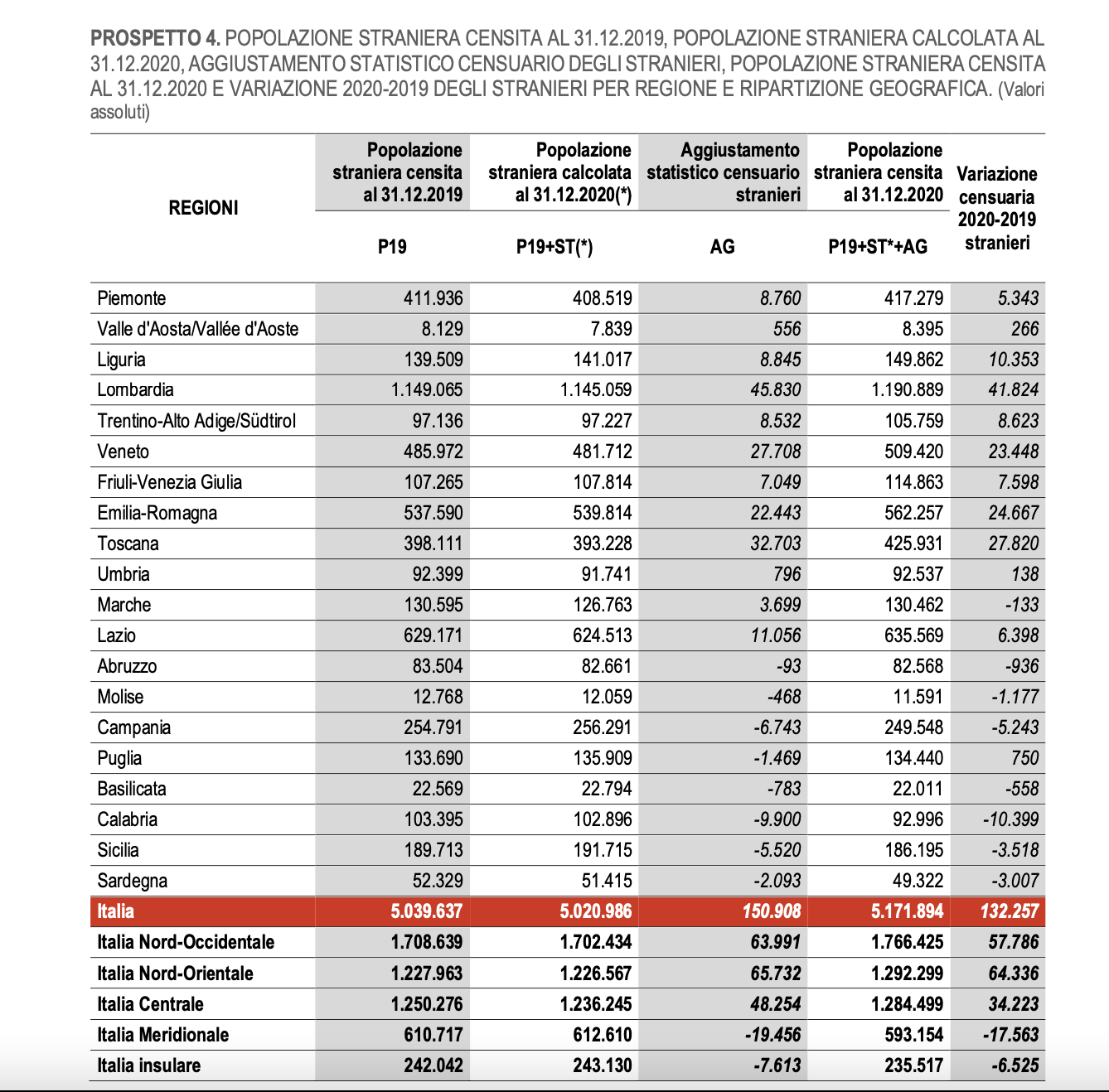 Infatti la Puglia è l’unica regione del Sud in cui la popolazione straniera aumenta, seppur di poco, mentre dalla Campania alla Sicilia scende anche il numero di persone di altra nazionalità. Gli stranieri “pugliesi” sono 134.440, e tra il 2019 e il 2020 sono saliti di appena 750 unità. Cifre in controtendenza, come mostra la tabella Istat in basso, ad esempio la popolazione straniera in Calabria è calata -10.399 in appena un anno.