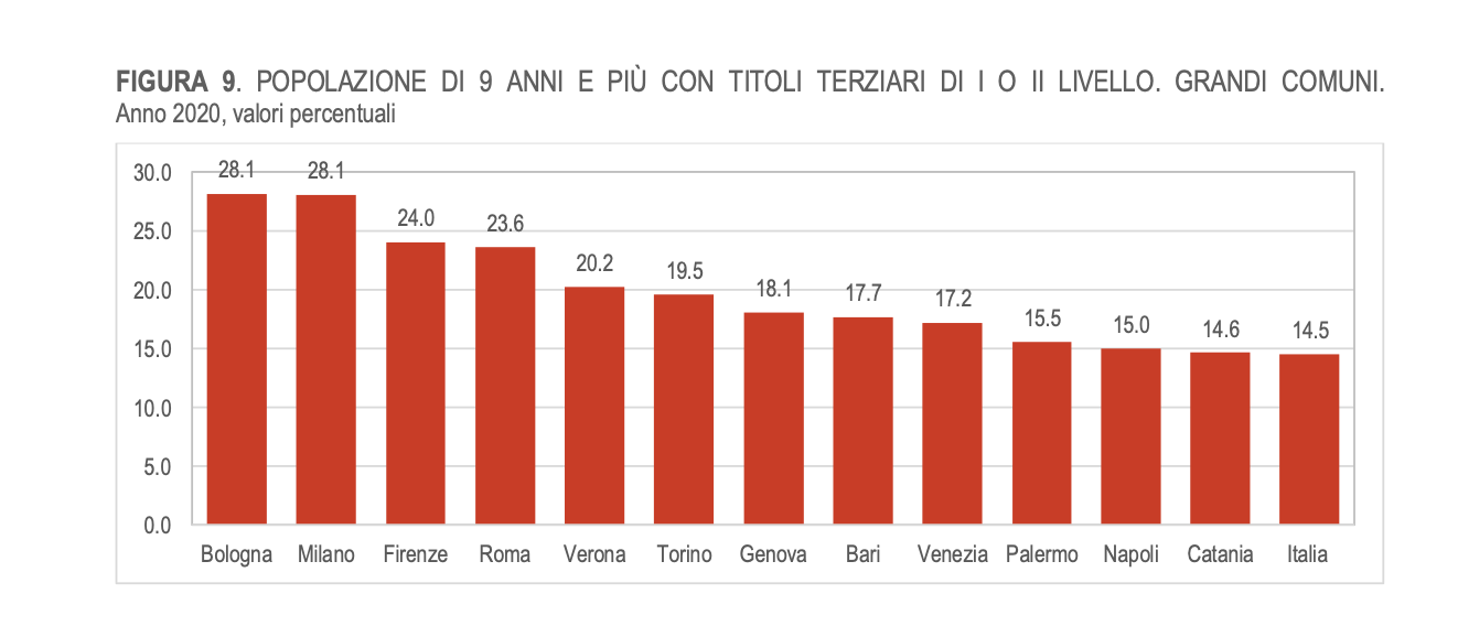 Infine la rilevazione sulla “cultura”. Nei comuni che, al 31 dicembre 2020, contano più di 250 mila residenti (Roma, Milano, Napoli, Torino, Palermo, Genova, Bologna, Firenze, Bari, Catania, Verona e Venezia) l’incidenza dei laureati è sistematicamente maggiore del dato nazionale (14,5%) con picchi oltre il 28% a Bologna e Milano. Il capoluogo pugliese è a metà graduatoria e fa meglio di due capitali del Meridione, Napoli e Palermo (immagine in basso). Fonte Istat QUI IL LINK