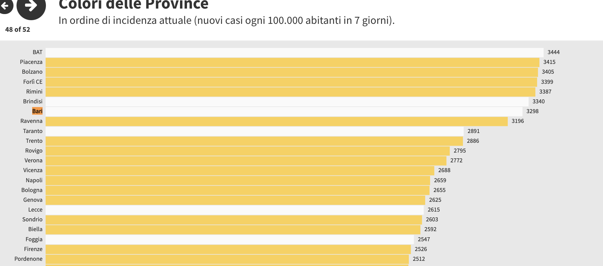 La quarta ondata di contagi ha raggiunto un nuovo picco nelle cinque provincie della Puglia. Dopo la Bat (prima nella classifica nazionale), è la città metropolitana di Bari a far registrare numeri mai raggiunti in precedenza: un positivo in isolamento ogni 32 residenti. Nel dettaglio, secondo le statistiche di Gimbe sui dati del Ministero della Salute, l’incidenza settimanale è a quota 3.298 (ogni 100.000 abitanti) raggiungendo la settima posizione.