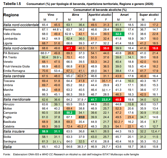La prevalenza dei consumatori di almeno una bevanda alcolica nel 2020 è stata del 77,8% tra gli uomini e 55,0% tra le donne e i valori sono rimasti stabili rispetto al 2019. Per entrambi i generi, come già evidenziato negli ultimi due anni, la prevalenza dei consumatori di amari è superiore alla media nazionale (M = 49,5%; F = 23,4%), così come le consumatrici di birra (41,0%), mentre è inferiore alla media la prevalenza dei consumatori di aperitivi alcolici, di vino e, per i soli maschi, di super alcolici.