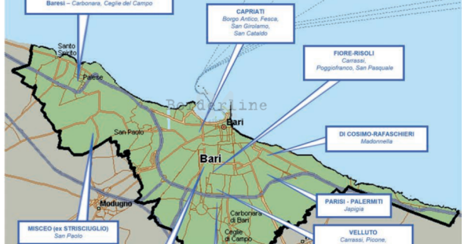 L’imponente compendio investigativo dell’inchiesta “Vortice-Maestrale” ha fatto luce anche sulle contrapposizioni di alcuni gruppi come quelli operativi a Conversano (BA) dove alcune fazioni del clan PARISI sarebbero transitate nella compagine criminale degli STRISCIUGLIO. Analogo conflitto di interessi si registra nel quartiere San Paolo dove il clan “della luna” è operativo con il gruppo TELEGRAFO staccato dai MISCEO. Quest’ultimi presumibilmente sarebbero transitati nella confederazione mafiosa opposta costituita dagli altri clan baresi tra cui in primis i CAPRIATI e i DIOMEDE-EX MERCANTE. Nel quartiere Madonnella il clan STRISCIUGLIO conterebbe sul gruppo DI COSIMO-RAFASCHIERI che reduce da una scissione interna avrebbe dato vita ad un’alleanza con soggetti appartenenti al primo clan. Nell’area metropolitana di Bari ancora caratterizzata dalla frammentarietà strutturale delle consorterie oltre agli STRISCIUGLIO altri tre clan storici quali i PARISI-PALERMITI, i CAPRIATI e i MERCANTE-DIOMEDE sarebbero ancora in grado di insinuarsi pericolosamente nei centri nevralgici del tessuto sociale produttivo manifestando tra l’altro mire espansionistiche anche sui territori della provincia.