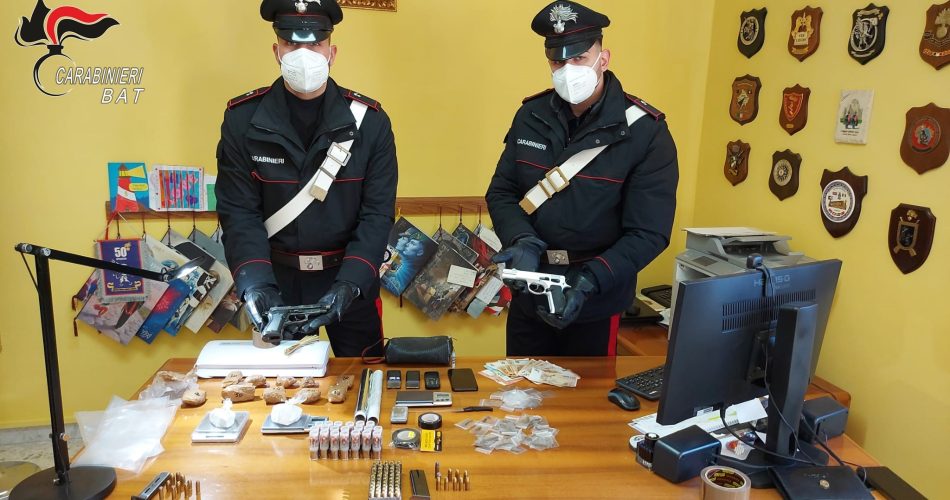 L’attività, che ha coinvolto oltre 70 militari dell’Arma, ha dato i suoi frutti poiché sono state tratte in arresto tre persone che dovranno rispondere di detenzione ai fini di spaccio di sostanza stupefacente, detenzione abusiva di armi e munizioni nonché di ricettazione. Più in particolare il primo dei tre soggetti, canosino cl. 56, è stato trovato in possesso di quasi 400 grammi di cocaina purissima, di una pistola con matricola abrasa oltre a un grosso quantitativo di munizioni; il secondo, pregiudicato anche lui del posto cl. 2000, è stato trovato in possesso di 28 dosi di hashish pronte per essere spacciate al dettaglio, mentre l’ultimo di una pistola scacciacani modificata perfettamente funzionante e del relativo munizionamento.