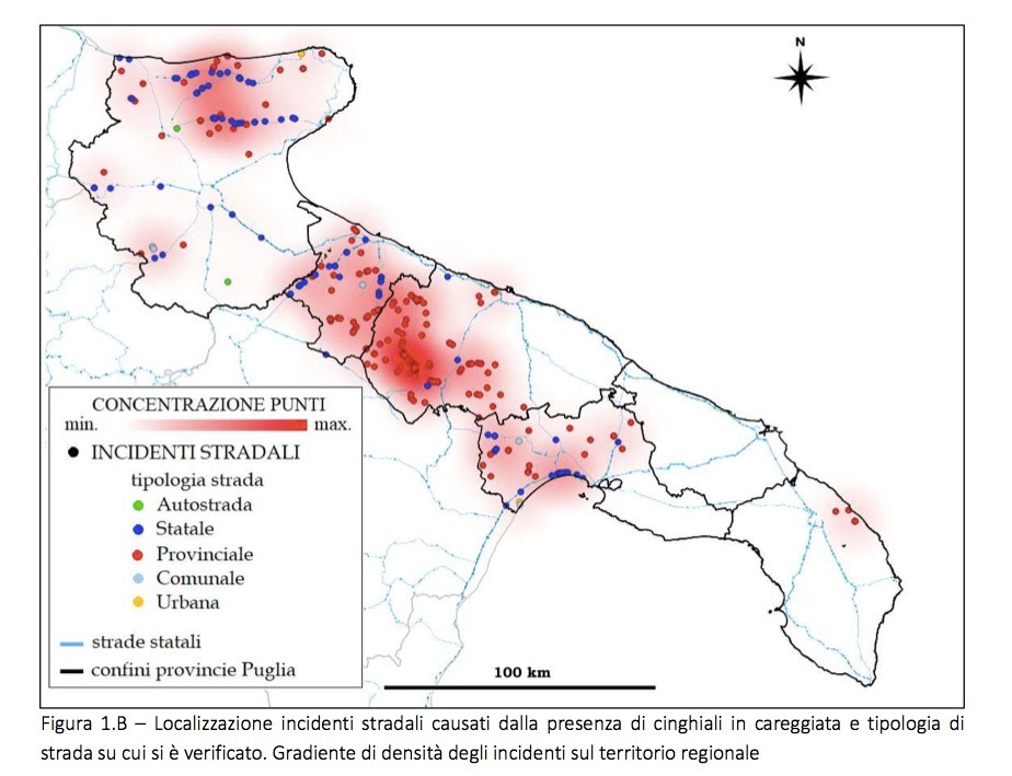 Le province maggiormente interessante dagli incidenti automobilistici sono quelle di Bari (108 incidenti) e Foggia (95 incidenti), ma è la provincia di Taranto ad aver registrato l’incremento più alto passando da un solo caso nel 2015 (primo anno in cui si sono verificati incidenti causati da ungulati nel Tarantino) a 27 episodi nel 2020. I dati evidenziano come le frequenze maggiori di incidentalità si registrino in determinati ambiti territoriali. Nella provincia di Bari il 68% degli eventi è localizzato nei comuni di Gravina, Altamura e Ruvo, mentre nella BAT il 75% dei casi è registrato nei comuni di Andria e Canosa. Anche nella provincia di Lecce gli incidenti, seppur in numero ridotto, sono stati registrati in settori contigui dei comuni di Lecce e Vernole. I comuni di Laterza e Ginosa contano il 40% degli eventi in provincia di Taranto, mentre nella provincia di Foggia gli incidenti hanno una distribuzione più diffusa nei diversi ambiti comunali con una maggiore frequenza nei territori di San Nicandro Garganico e Cagnano Varano. Le aree a maggiore incidentalità ricadono tendenzialmente all’interno di zone protette o in aree contigue ad esse dove la specie tende a concentrarsi per una maggiore disponibilità di risorse e siti di rifugio.