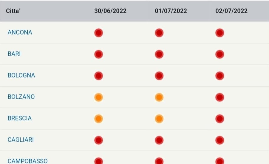 Prosegue l’ondata di caldo intenso in Puglia. Secondo il Ministero della salute, che già aveva inserito oggi Bari tra le città con il bollino rosso, anche domani e sabato 2 luglio la elenca tra le città al livello massimo di allerta.