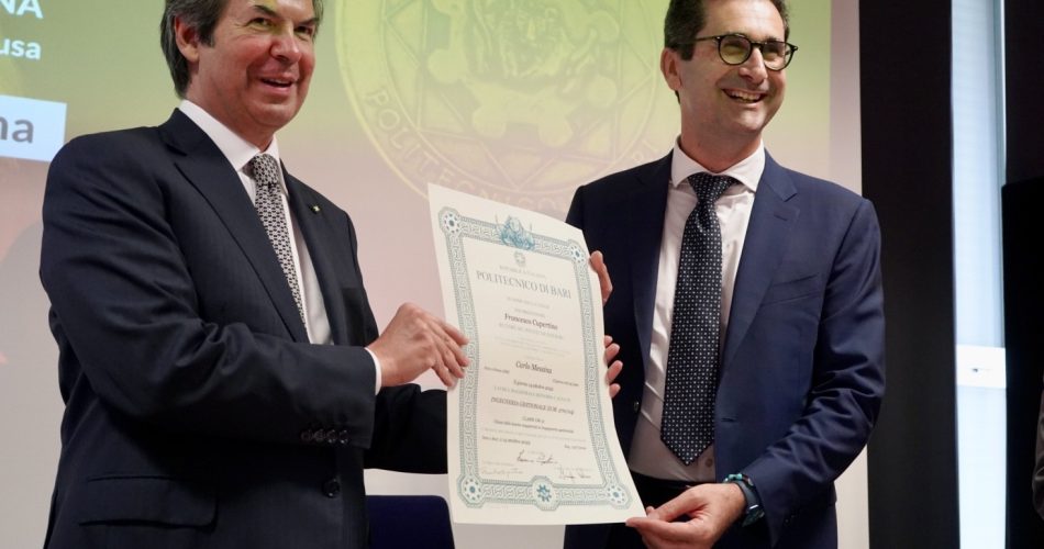 Laurea ad Honoris Causa per il Ceo e leader di Intesa Sanpaolo, Carlo Messina. È il riconoscimento che il rettore del Politecnico di Bari, ha voluto dargli in seguito alla nomina di neo Ingegnere Gestionale del Poliba. “È un grande riconoscimento di cui sono veramente orgoglioso” – ha dichiarato rivolgendo poi le sue parole al Poliba – “indubbiamente è una istituzione eccellente. Rappresenta un punto di forza per tutto il sud e anche il posizionamento in questi nuovi progetti finalizzati all’energia come leader da una chiara capacità di avere una visione strategica per il futuro. Questo è il polo dell’energia e ed il settore più importante su cui fare leadership fra tutti gli altri atenei. Qui c’e un potenziale enorme e anche un ottimo corpo docente e un ottimo rettore” – ha concluso.