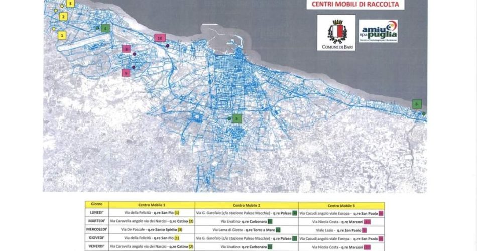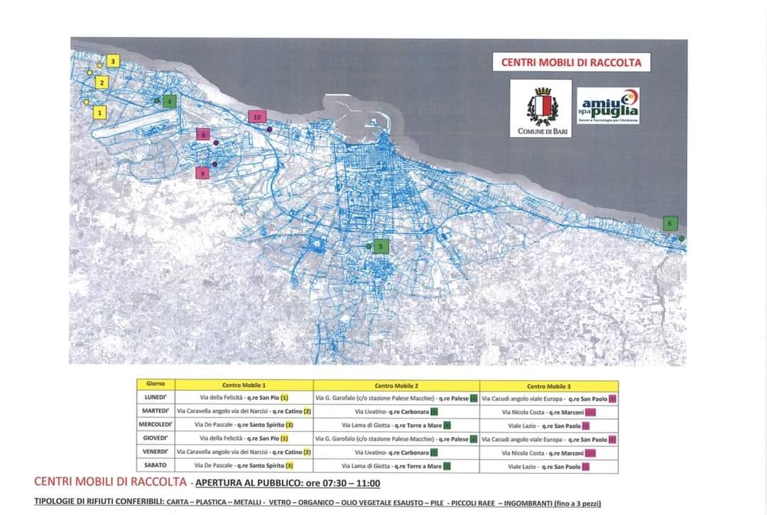 Sull’intero territorio cittadino Amiu Puglia posizionerá secondo il calendario allegato e nelle strade riportate dettagliatamente nella mappa allegata le 3 postazioni mobili che saranno fruibili ai cittadini dalle 7.30 alle 11.