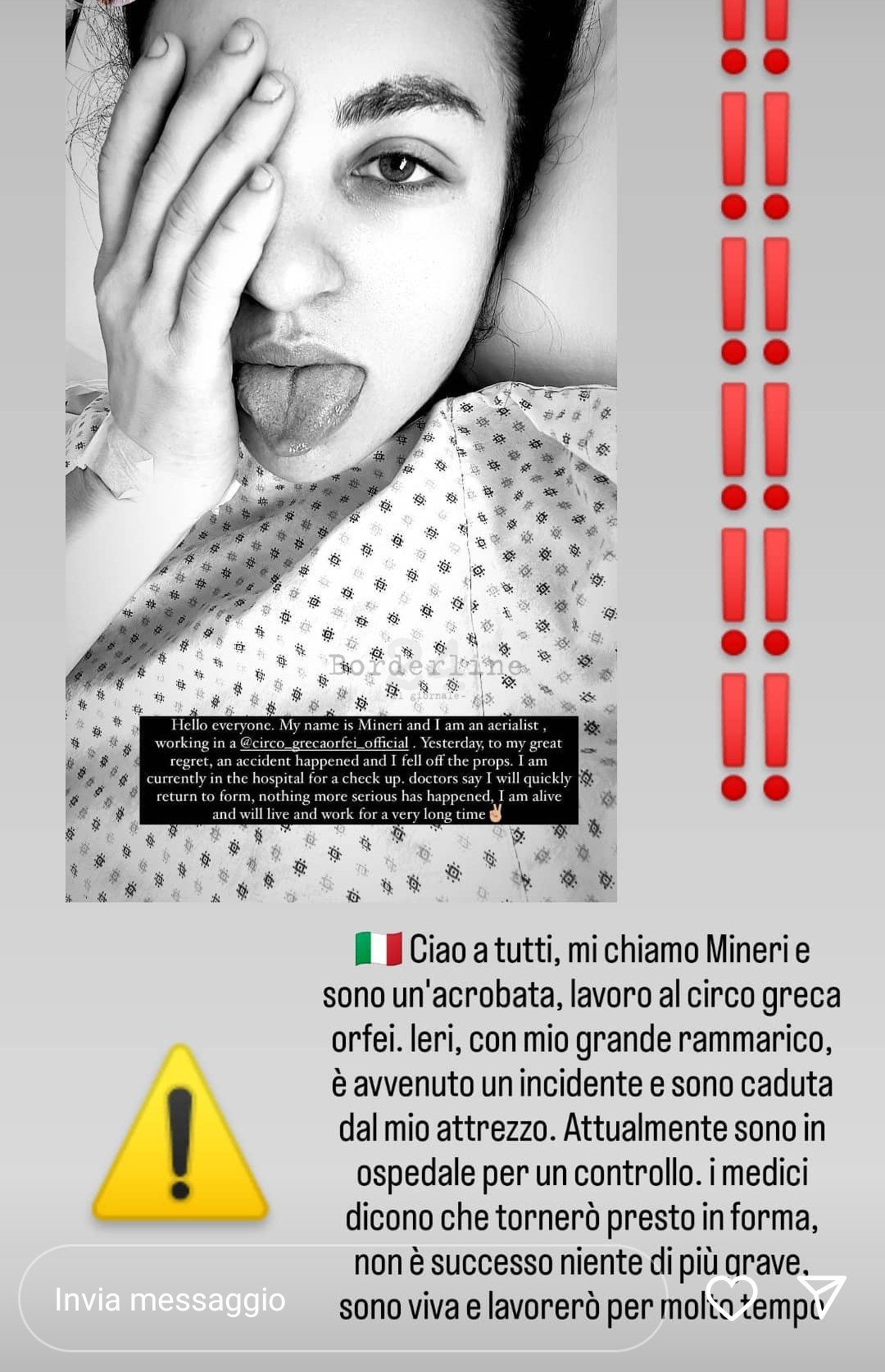 sera è precipitata da circa 4 metri mentre si esibiva in avvitamenti al nastro, rassicura tutti sul proprio stato di salute: “Tornerò presto in forma”. “Ciao a tutti – scrive accanto alla sua foto mentre fa una smorfia buffa e si copre con una mano metà del volto – mi chiamo Mineri e sono una acrobata. Ieri con mio grande rammarico è avvenuto un incidente e sono caduta al mio attrezzo. Attualmente sono in ospedale per un controllo. I medici dicono che tornerò presto in forma, non è successo niente di più grave, sono viva e lavorerò per molto