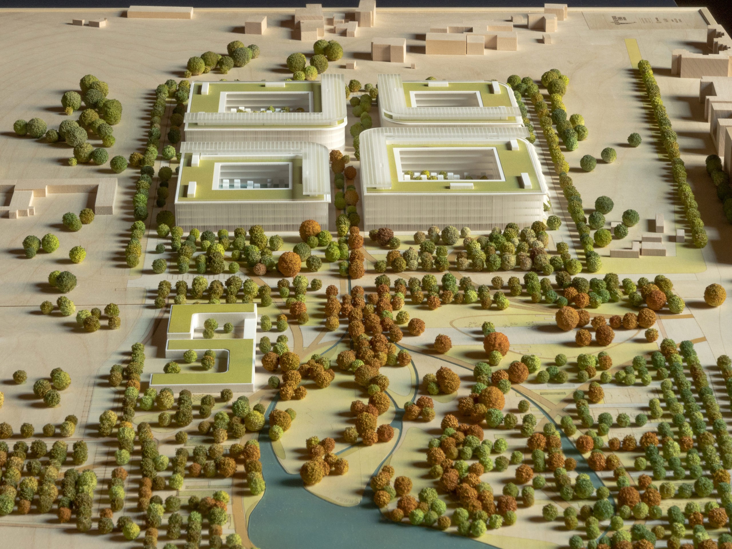 La superficie verde del Parco sarà di 105mila metri quadrati con una porzione di 7500 metri quadrati dedicata a un lago artificiale. L’estensione dell’area piantumata è, in realtà, ancora più ampia, considerando le coperture e le corti a verde: natura e costruito si bilanciano in un rapporto in cui la presenza della vegetazione impegnerà la quasi totalità della superficie di progetto.